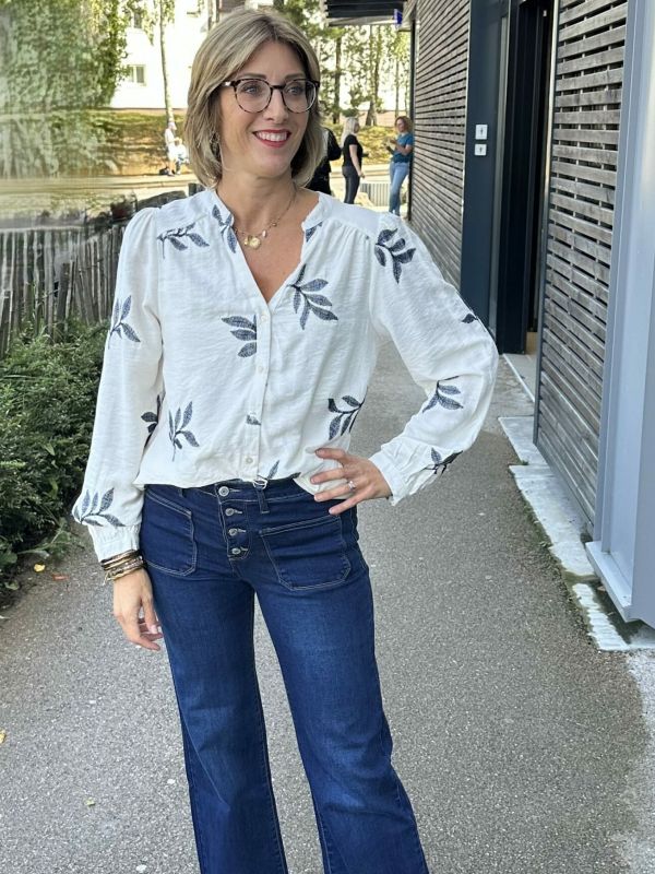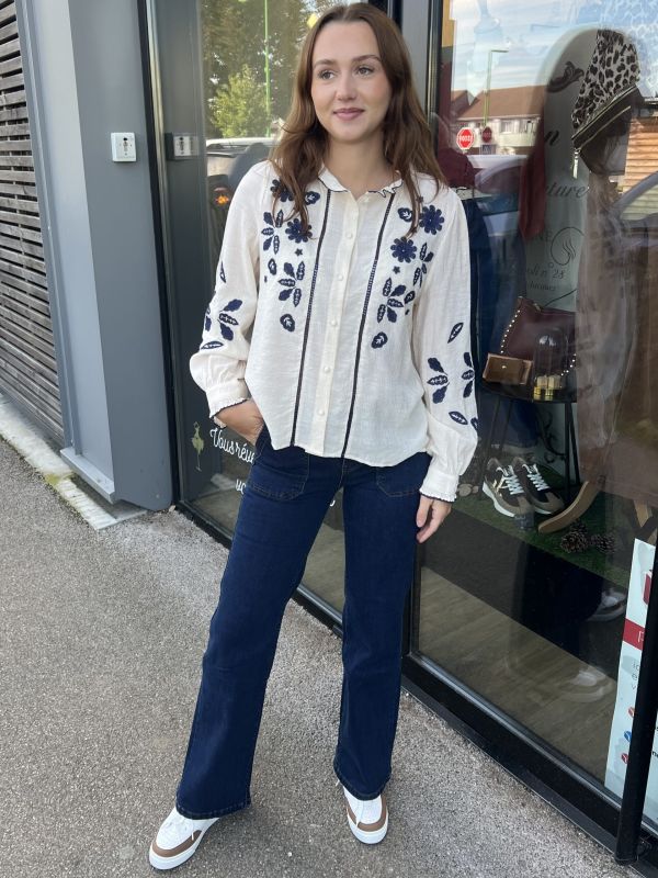 BLOUSE ÉCRU BRODERIE BLEUE