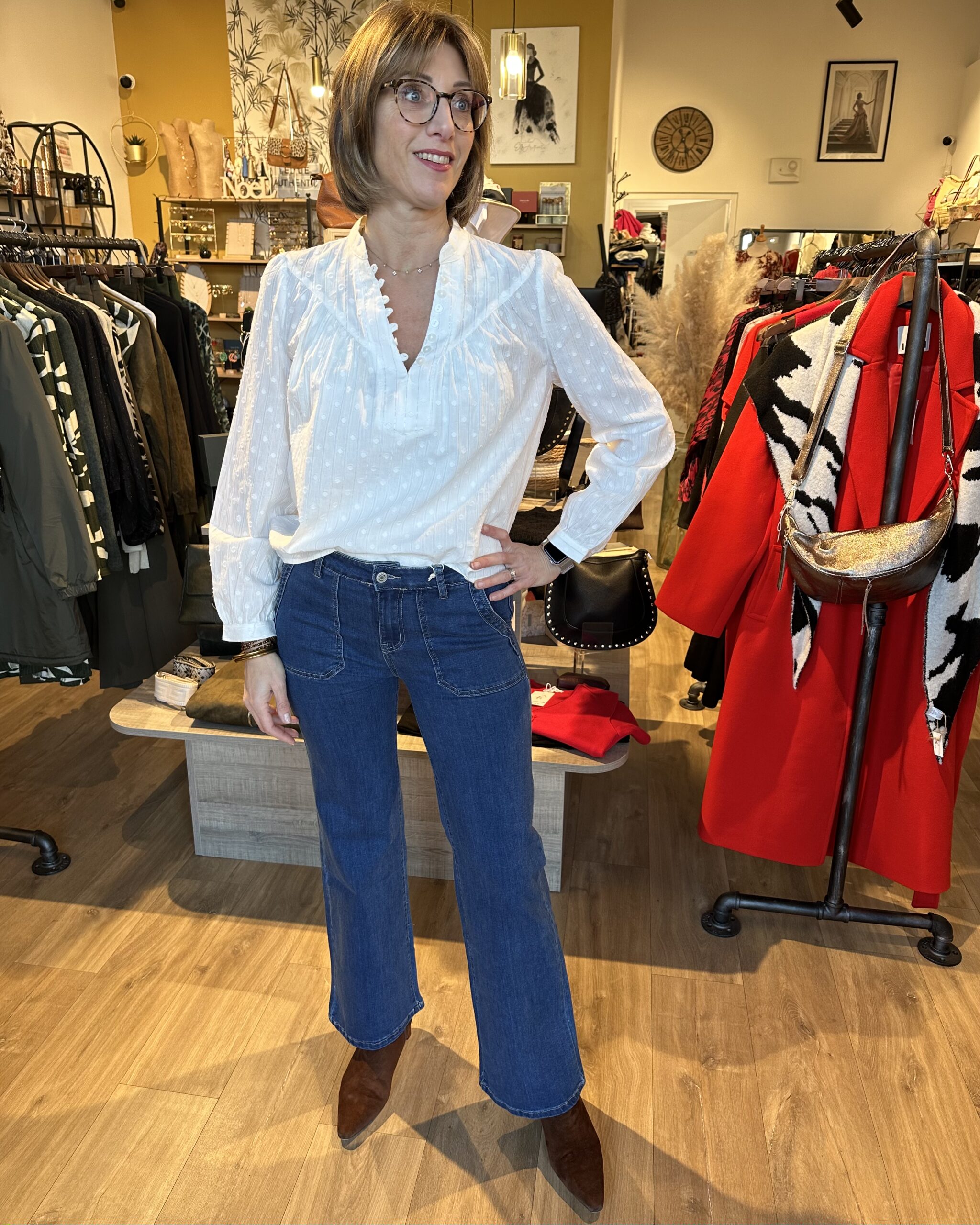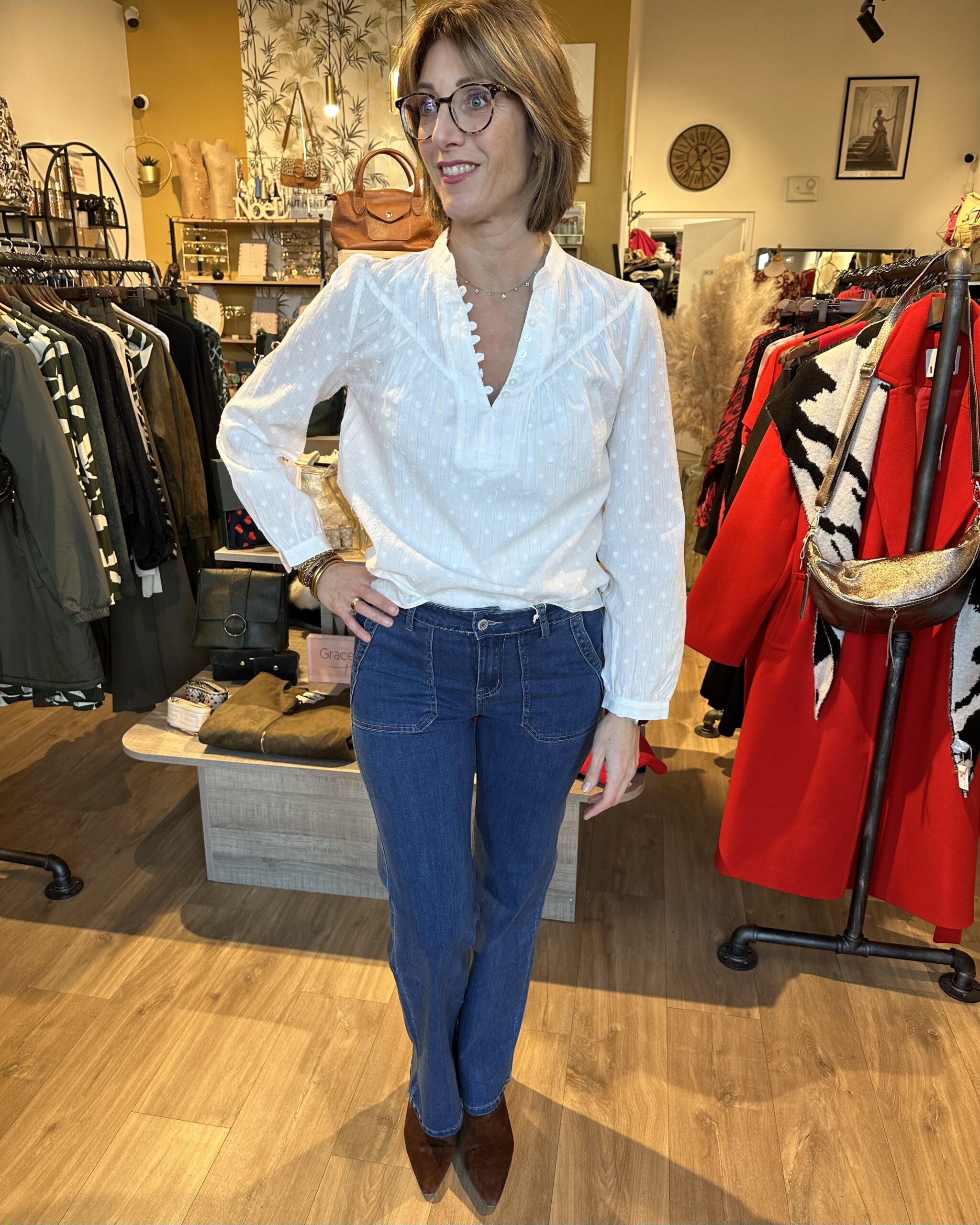 Facile à associer, cette blouse blanche se porte aussi bien avec un jean pour un look casual qu’avec une jupe ou un pantalon habillé pour une tenue plus sophistiquée. Sa coupe confortable en fait une pièce idéale pour le quotidien, du bureau aux sorties.