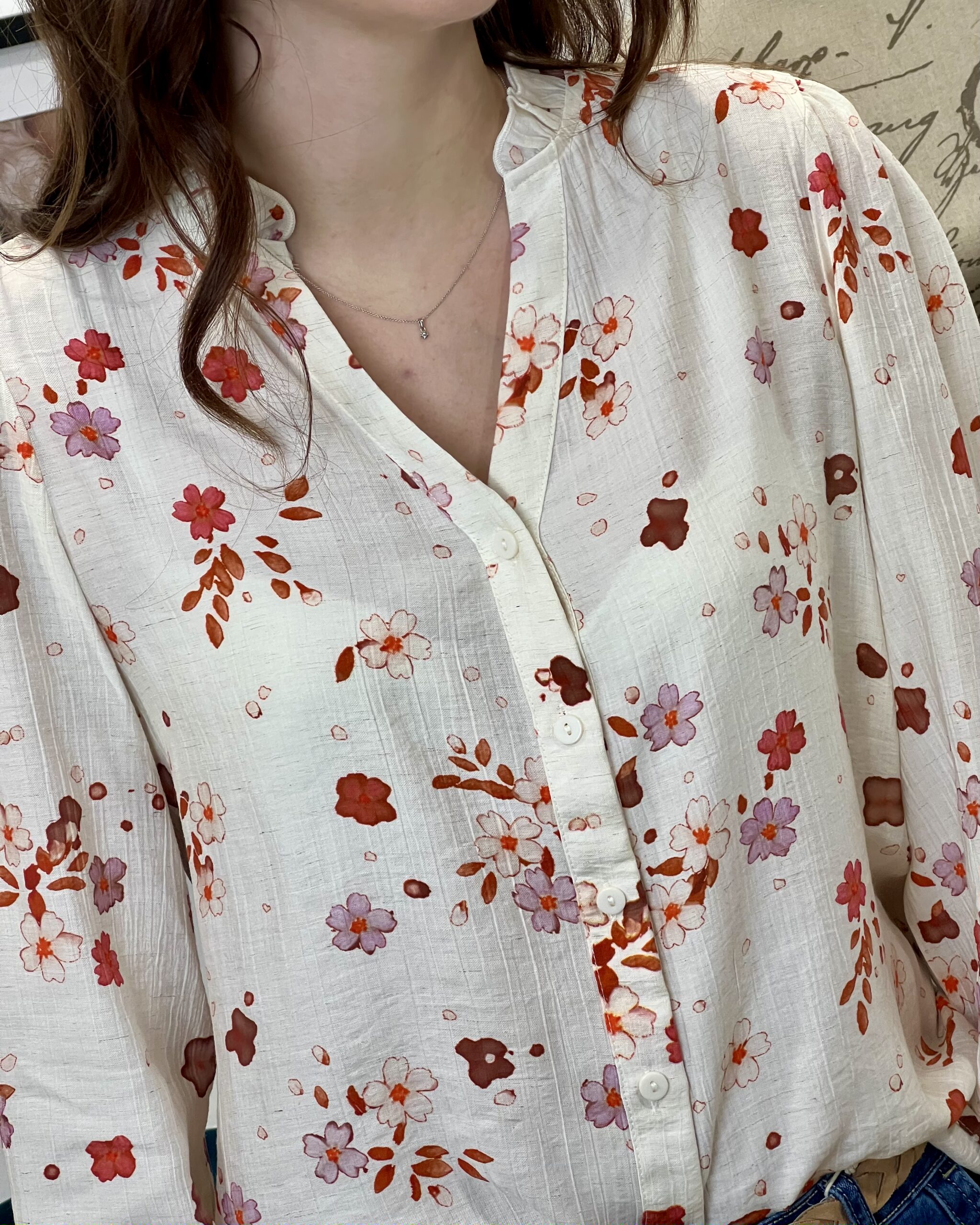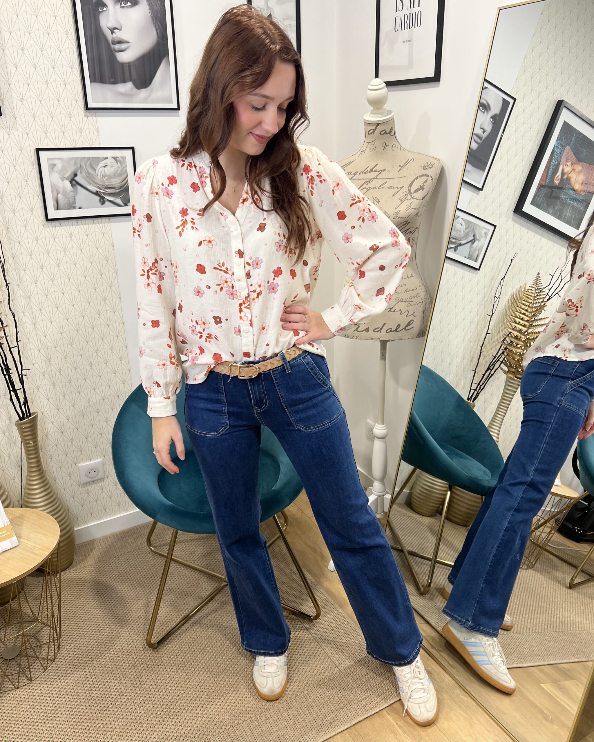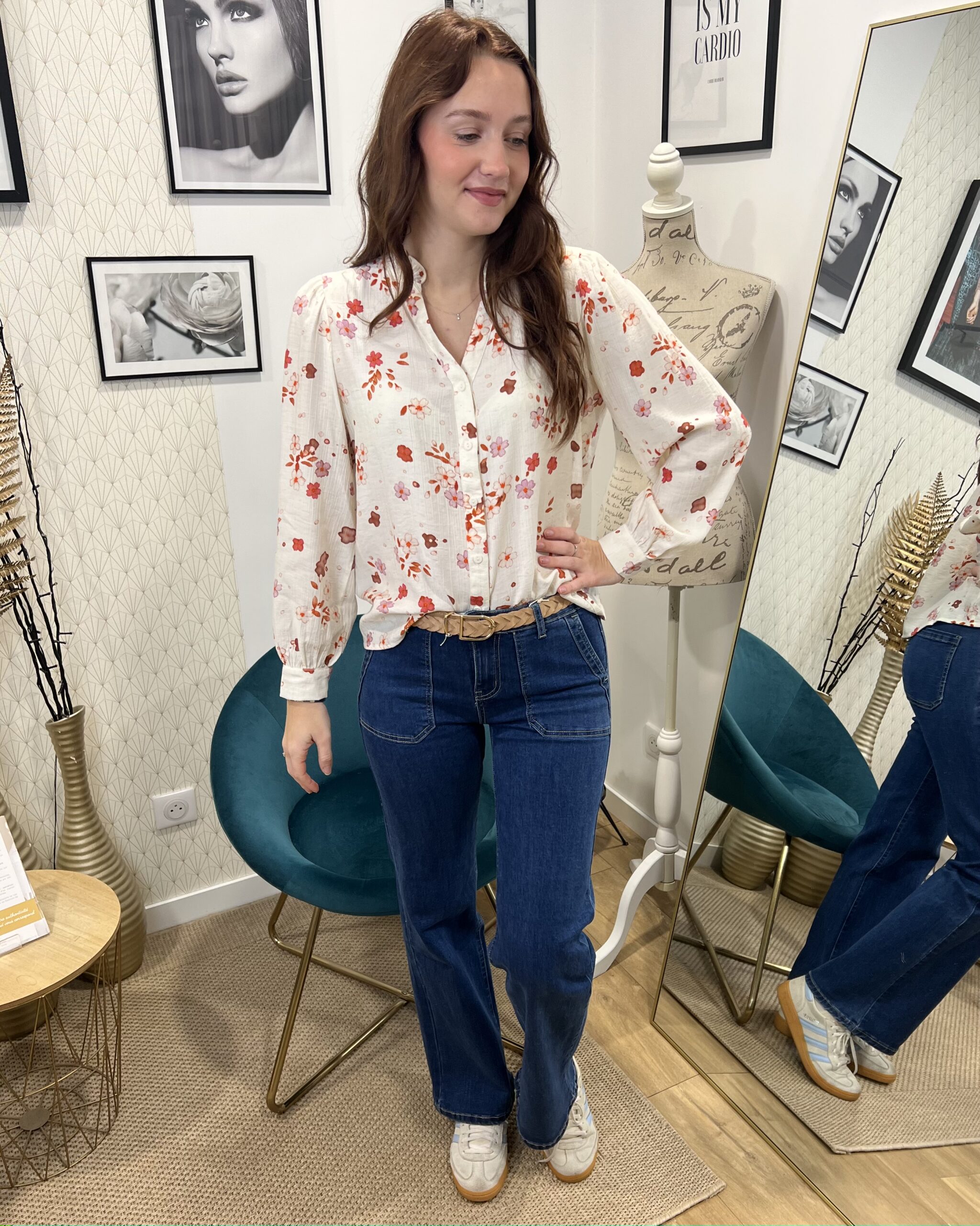 BLOUSE ÉCRU FLEURS ROSE ET ROUGE