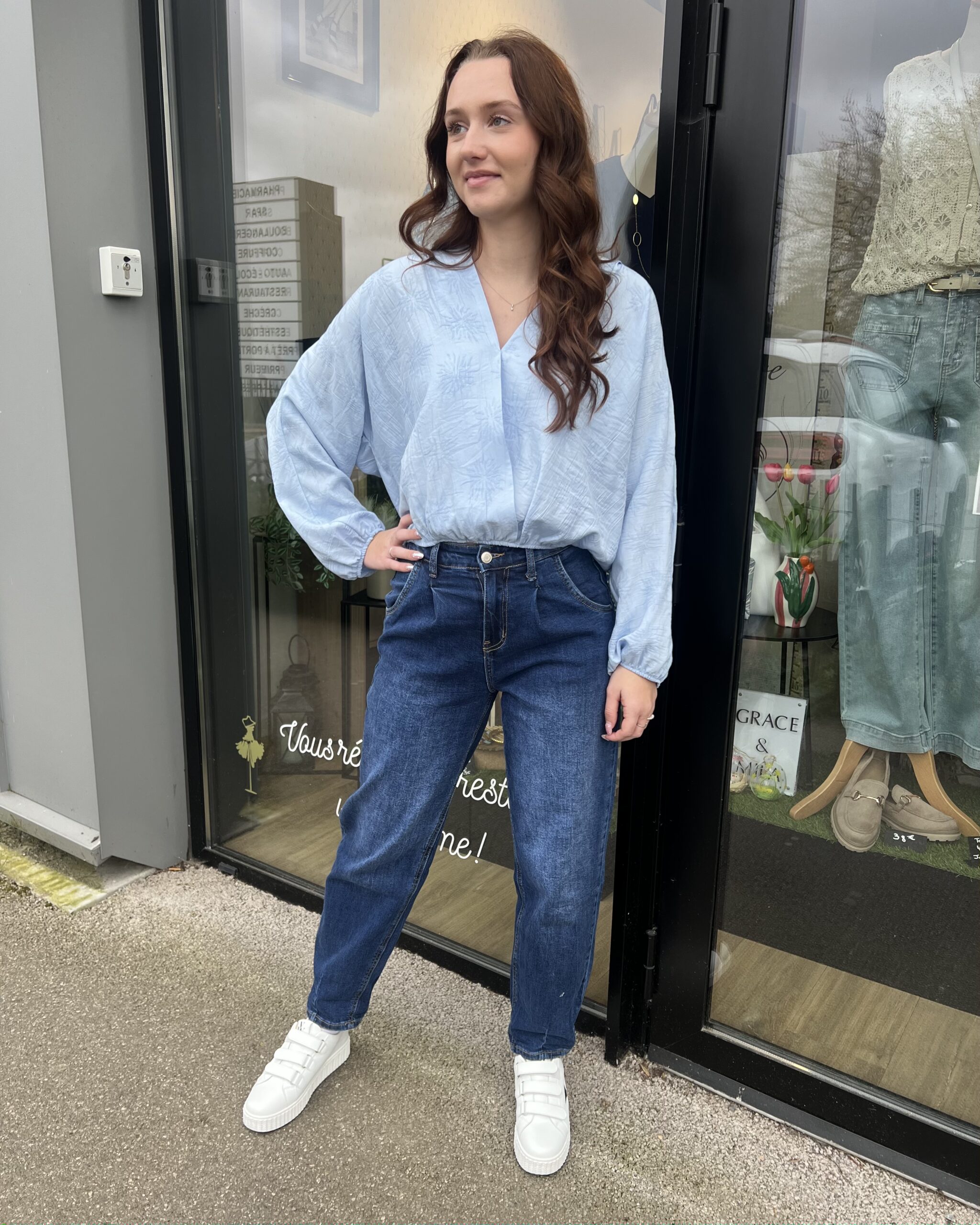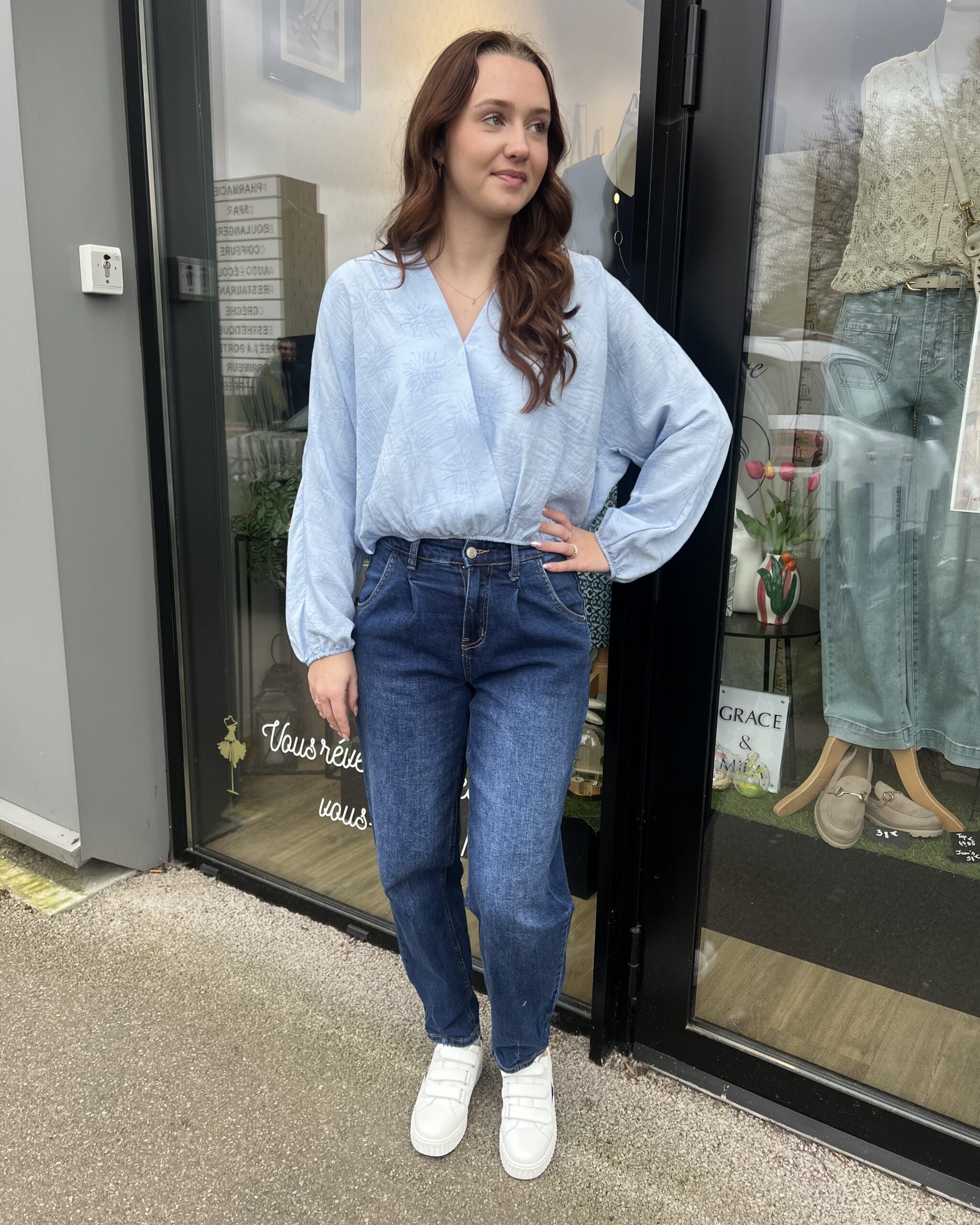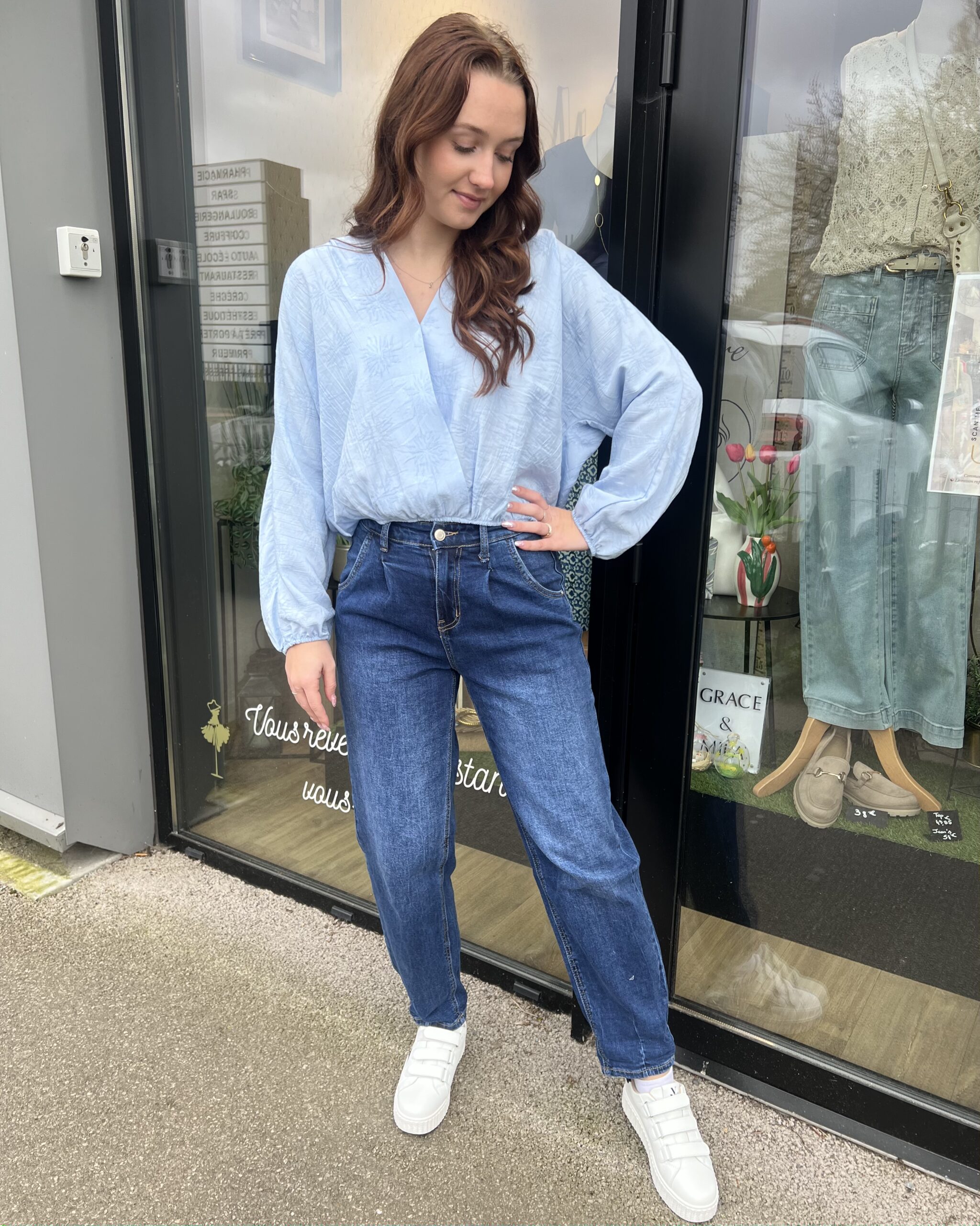BLOUSE UNI BLEUE MANCHE ÉLASTIQUE