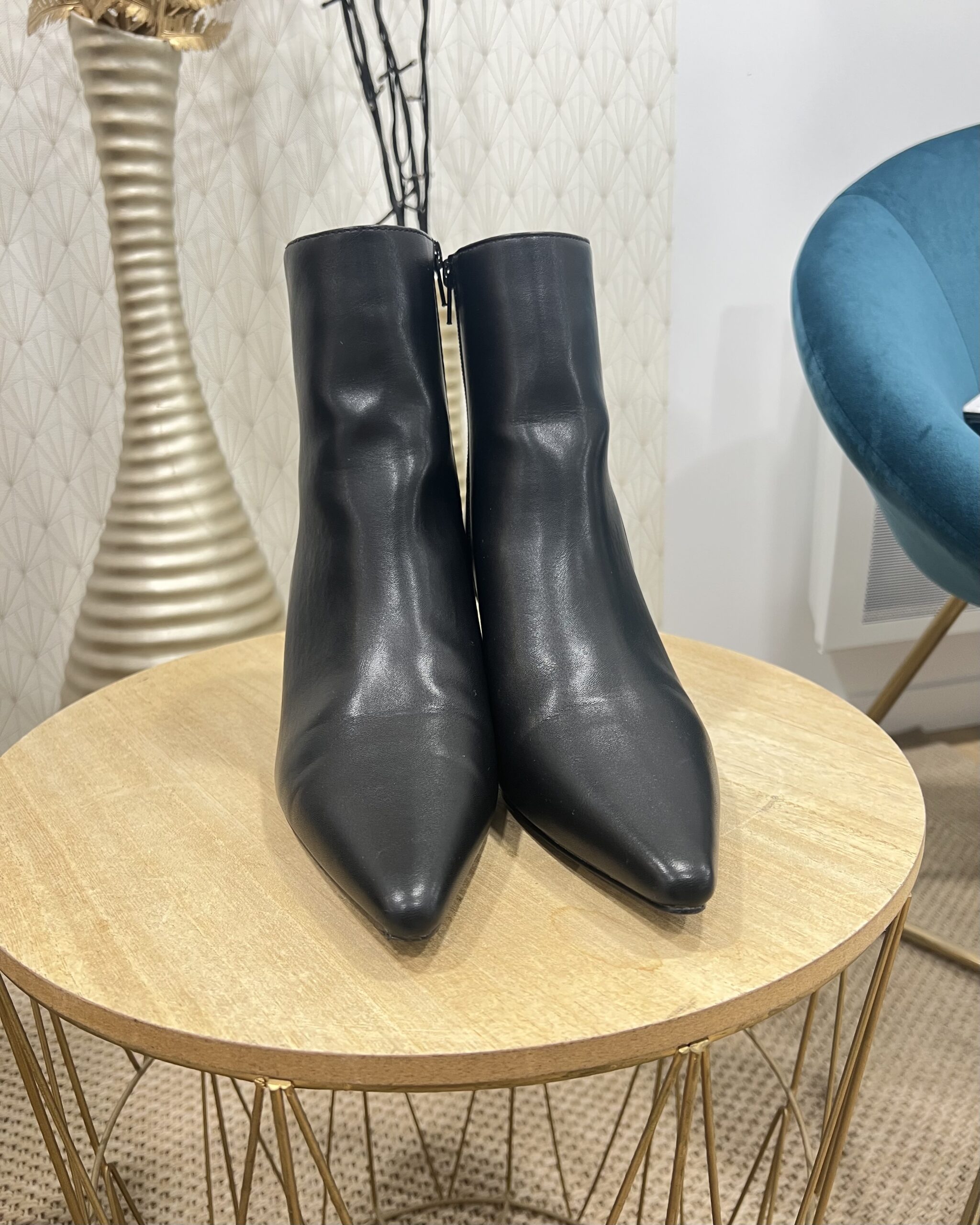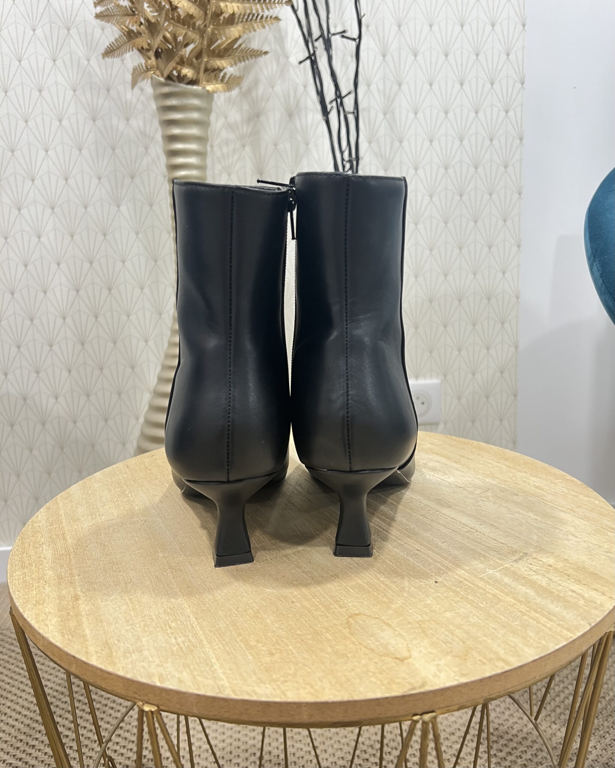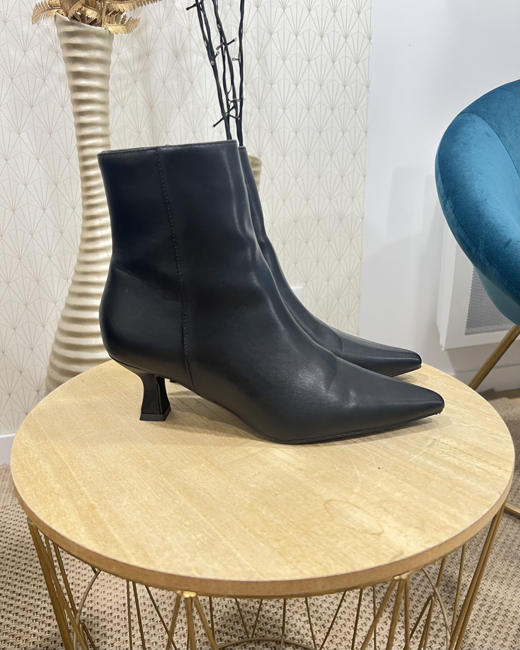 Les bottines noires à talon kitten sont l’alliance parfaite entre élégance et confort. Leur petit talon, fin et stable, affine la silhouette sans jamais fatiguer le pied, ce qui en fait une chaussure idéale pour vos journées bien remplies comme pour vos soirées habillées. Leur matière souple épouse la forme du pied et leur design épuré apporte une touche chic à toutes vos tenues.