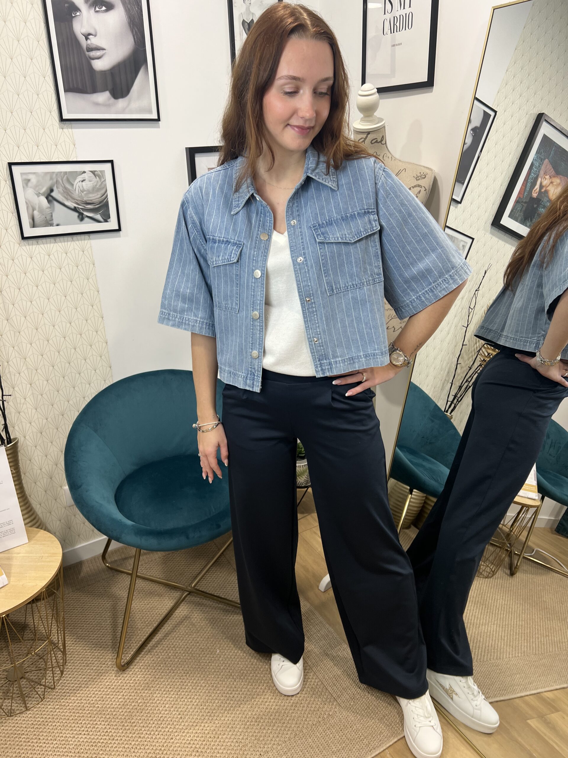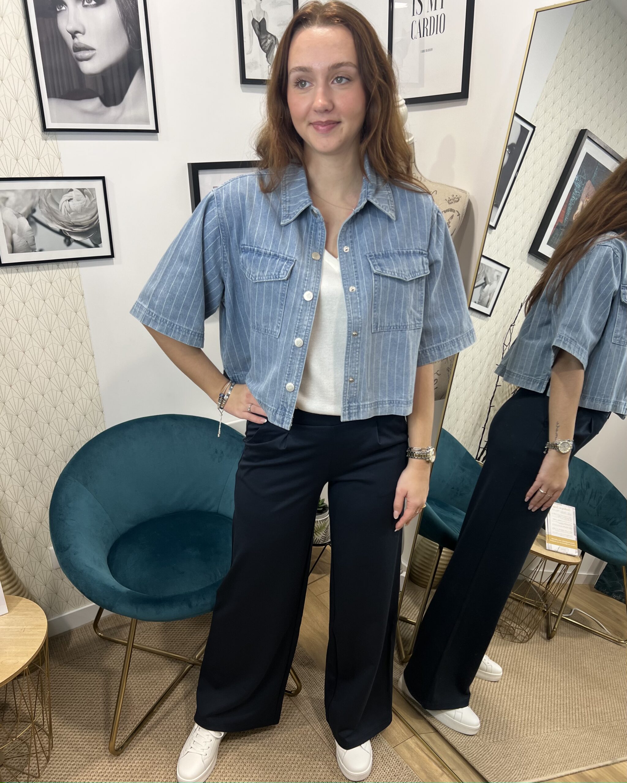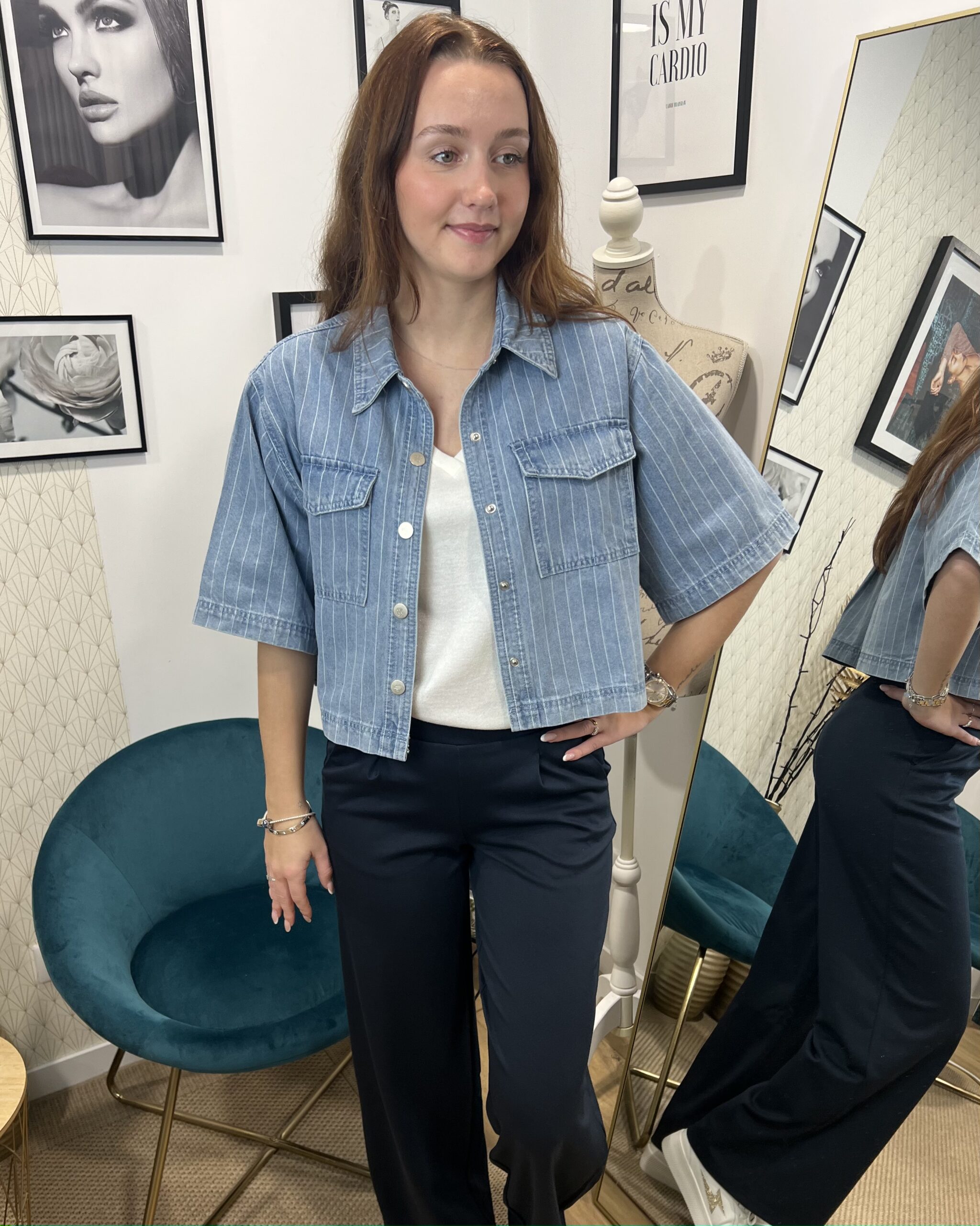 La chemise courte oversize jean est une pièce polyvalente qui apporte style et décontraction à vos tenues. Confectionnée en denim bleu avec rayures blanches, elle combine confort et modernité. Cette chemise peut se porter seule ou comme veste légère sur un tee-shirt, pour créer des looks variés.