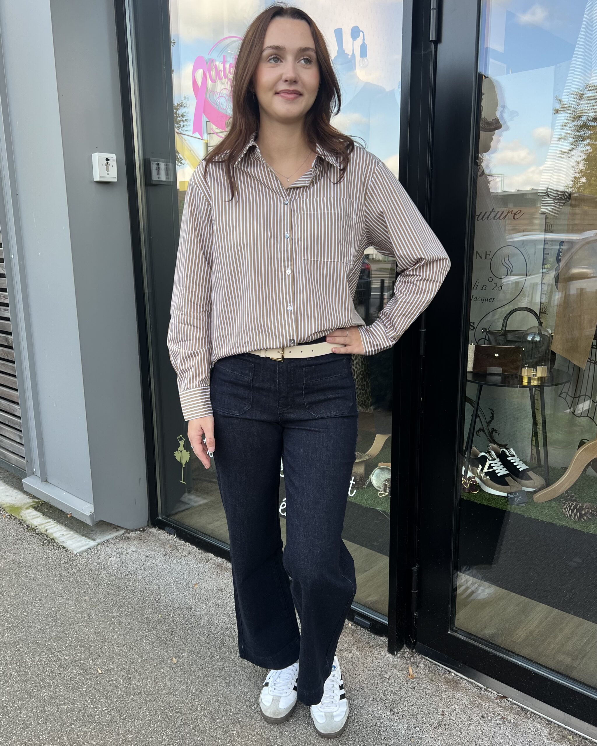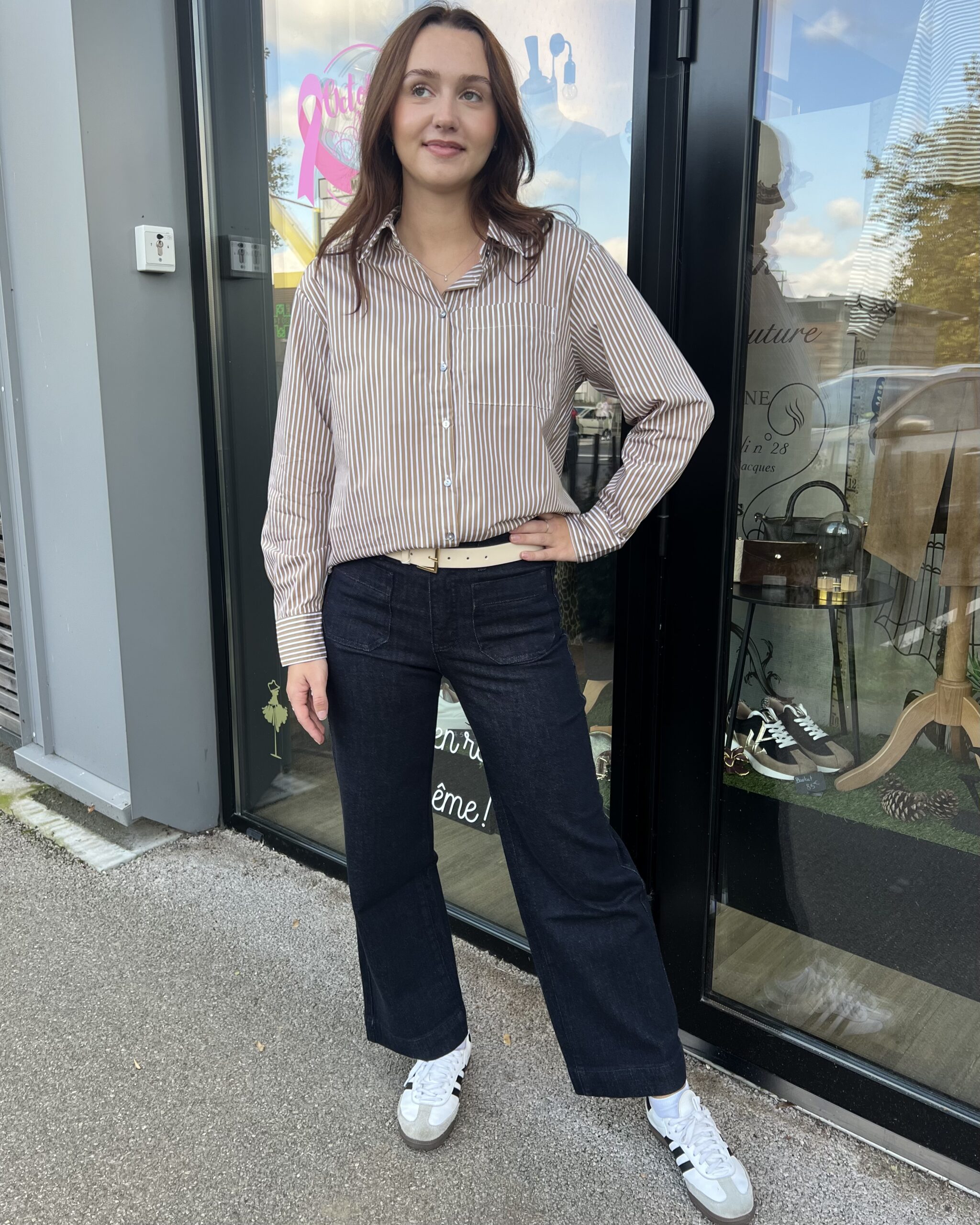 la chemise à rayures, c’est le basique de la garde-robe. Elle apportera sans contexte du style à vos tenues. En version beige et blanc, sobre, elle sera parfaite sur un jeanset avec un veste pour une journée de travail.