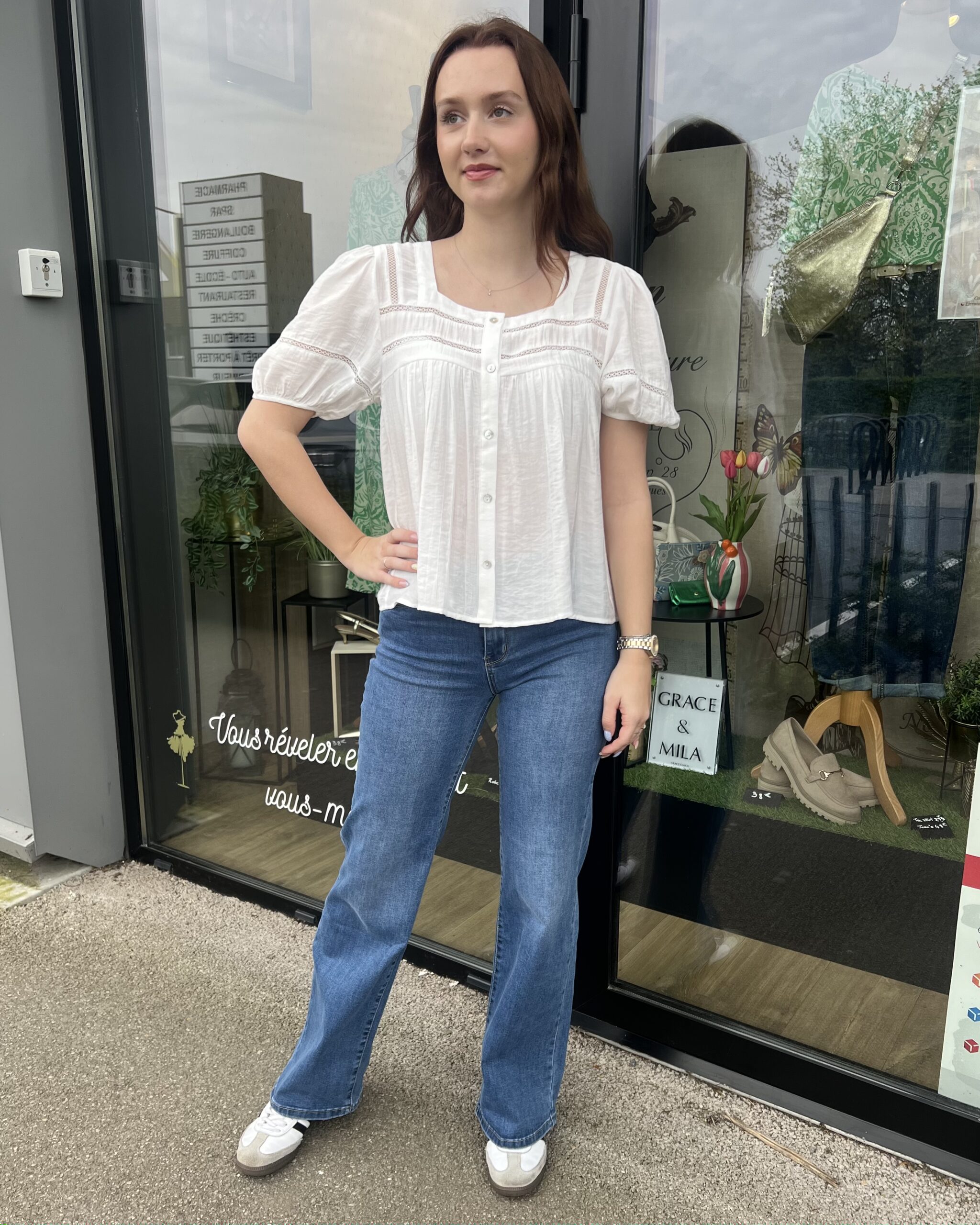 Apportez une touche de modernité à votre dressing avec ce chemisier blanc à col carré. Sa coupe raffinée met en valeur le port de tête et apporte immédiatement une allure chic et féminine.