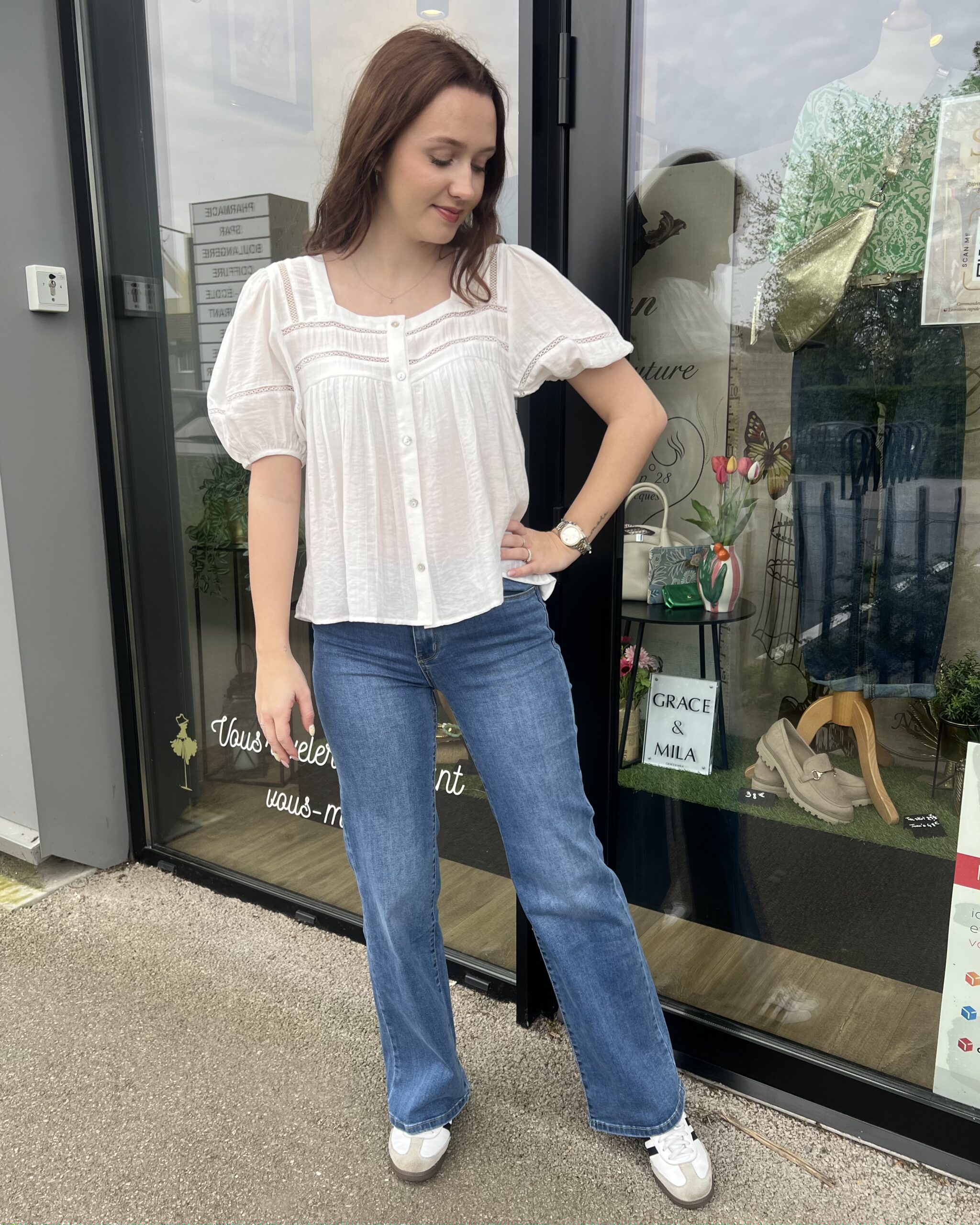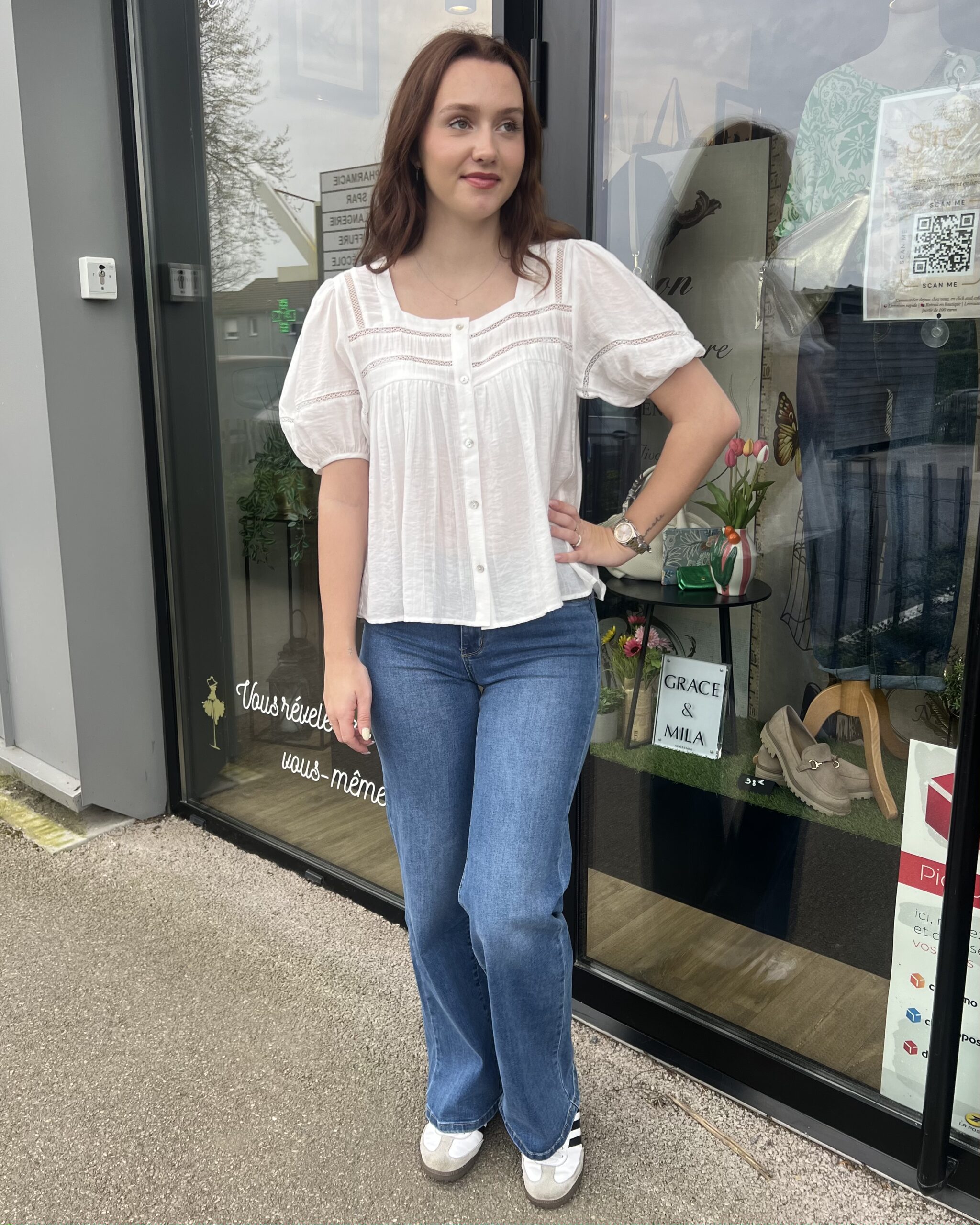 Sa couleur blanche en fait une pièce intemporelle, facile à associer avec tous les styles, du plus casual au plus habillé. Le col carré structure la silhouette tout en ajoutant une note tendance subtile.
