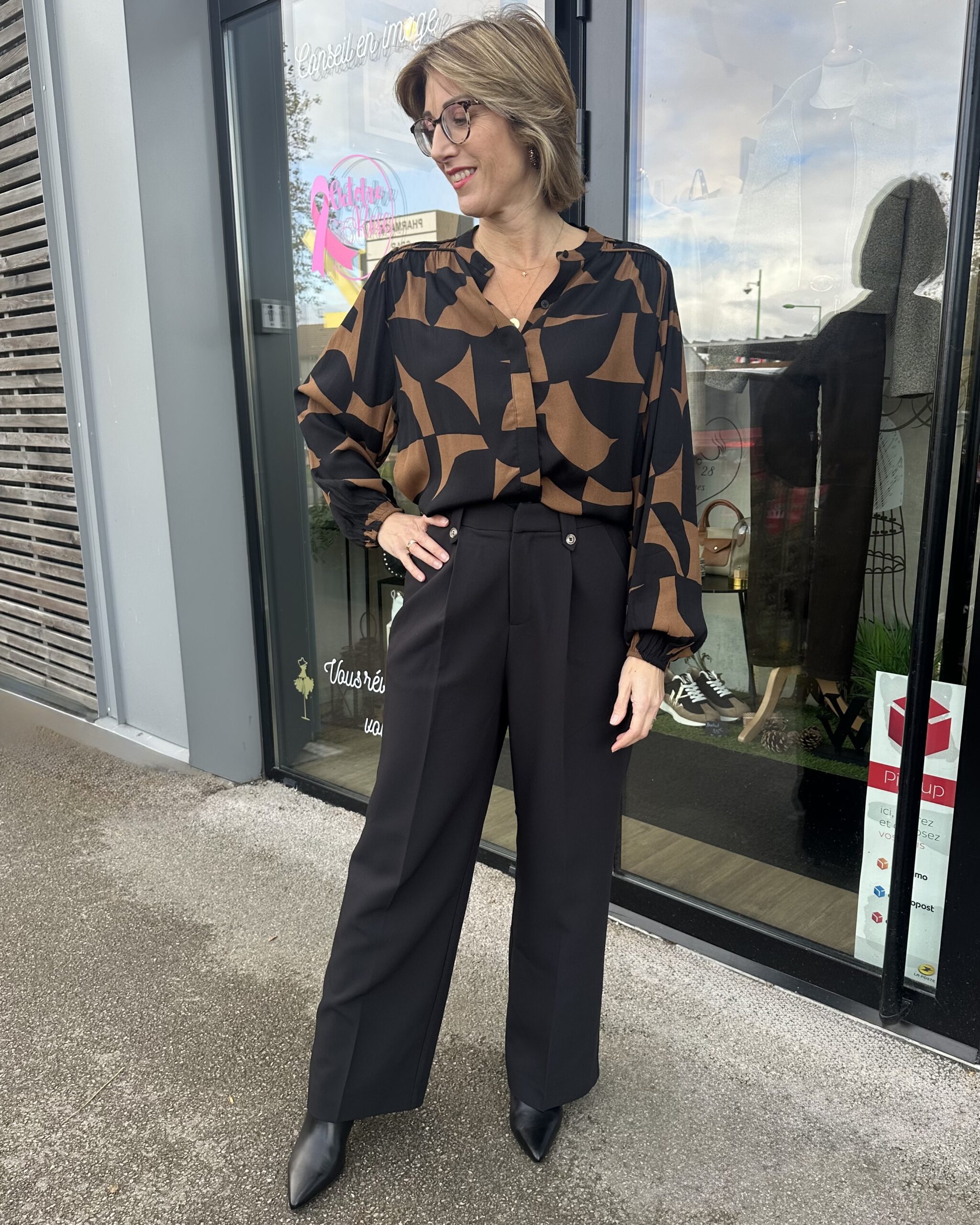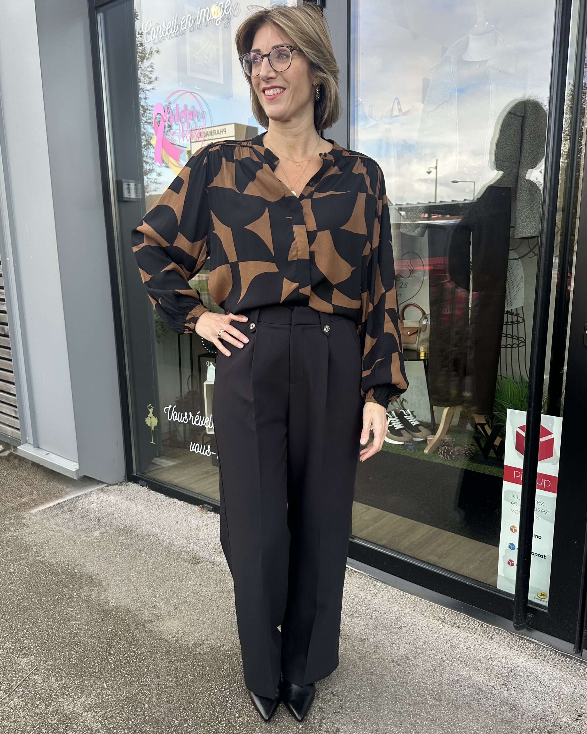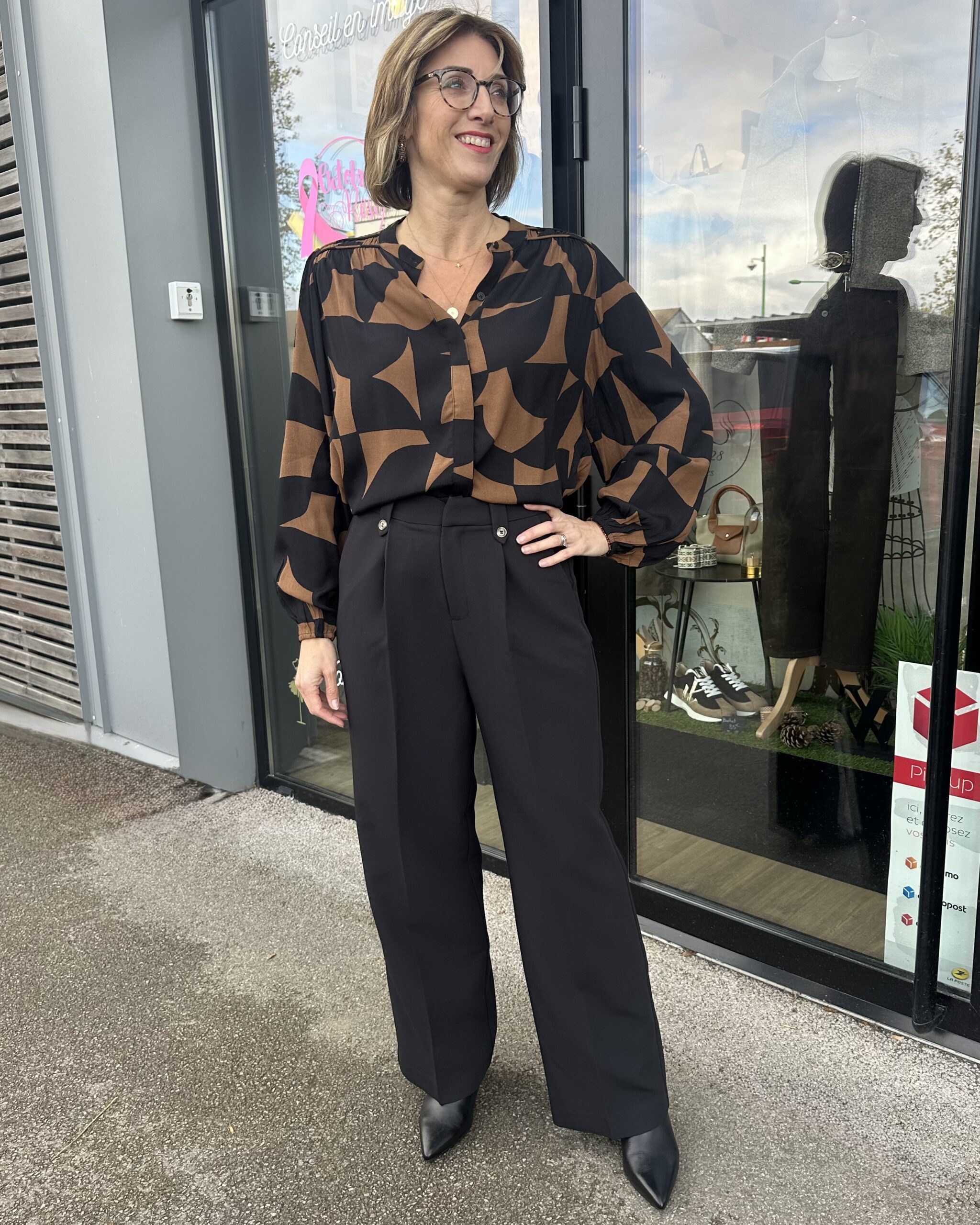Le CHEMISIER MARRON NOIR FORME GÉOMÉTRIQUE combine élégance et audace.