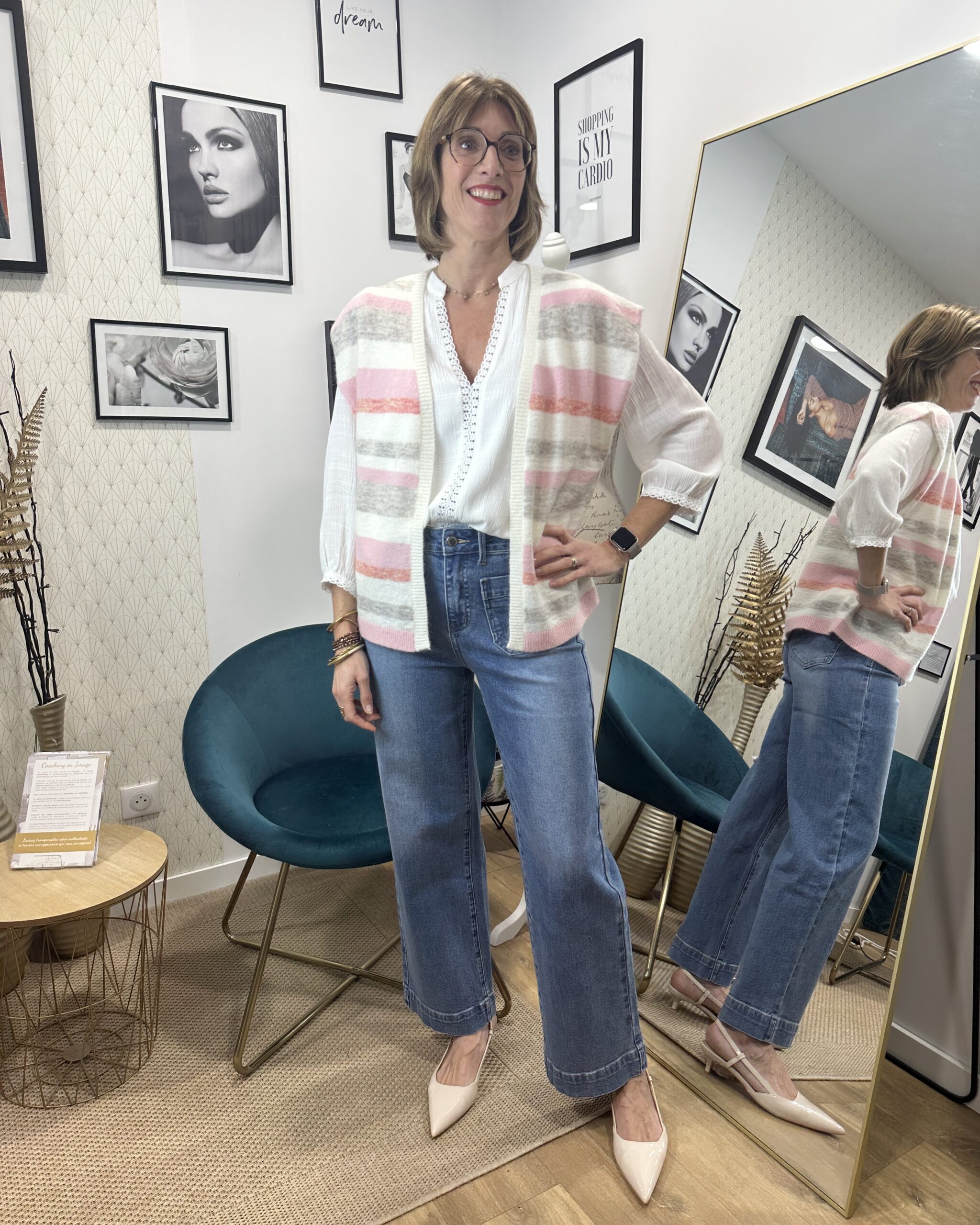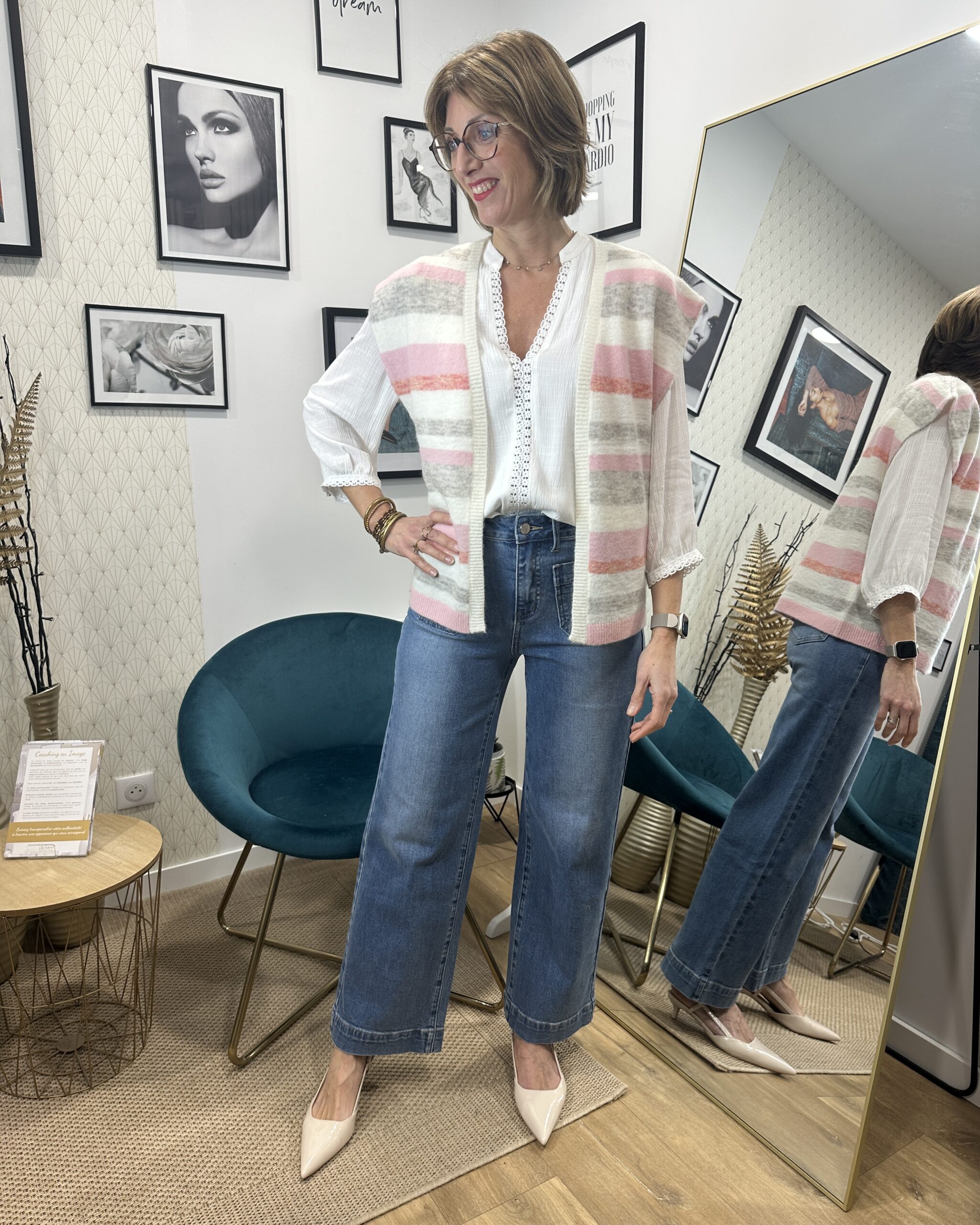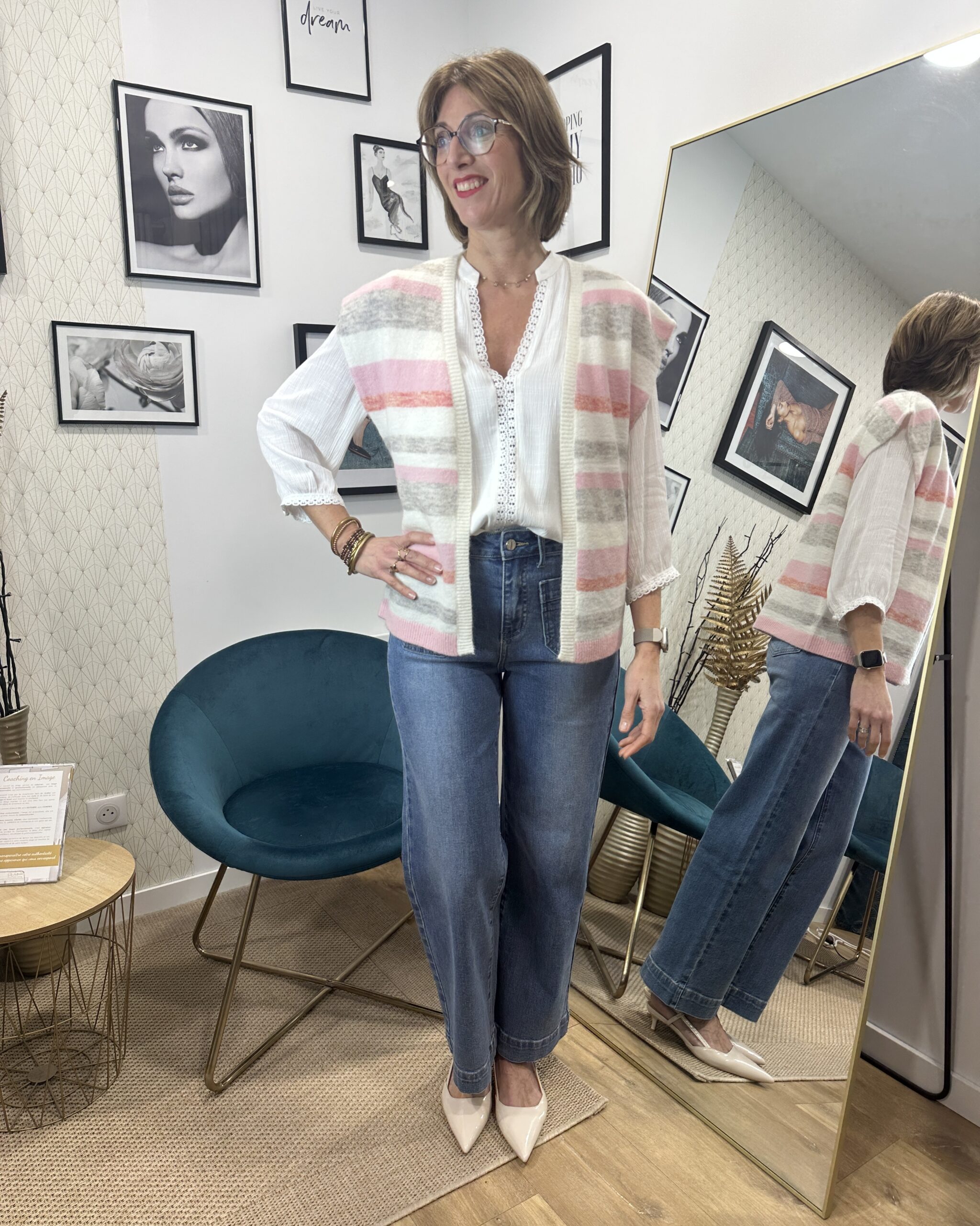 Son imprimé rayures dans les teintes rose et gris sur fond écru apporte modernité et luminosité à la tenue.