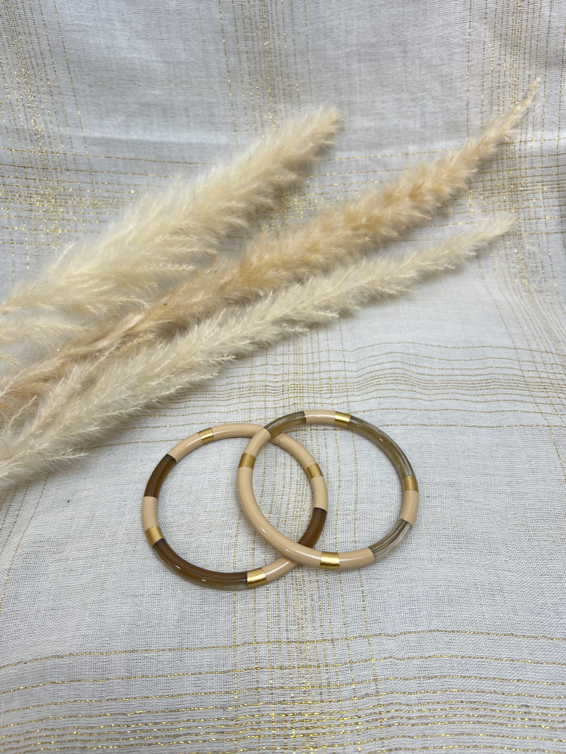 Les JONCS CORNE SUBLIME BEIGE se distinguent par leur teinte neutre et chic. Leur finition dorée illumine vos poignets avec une touche subtile et élégante.