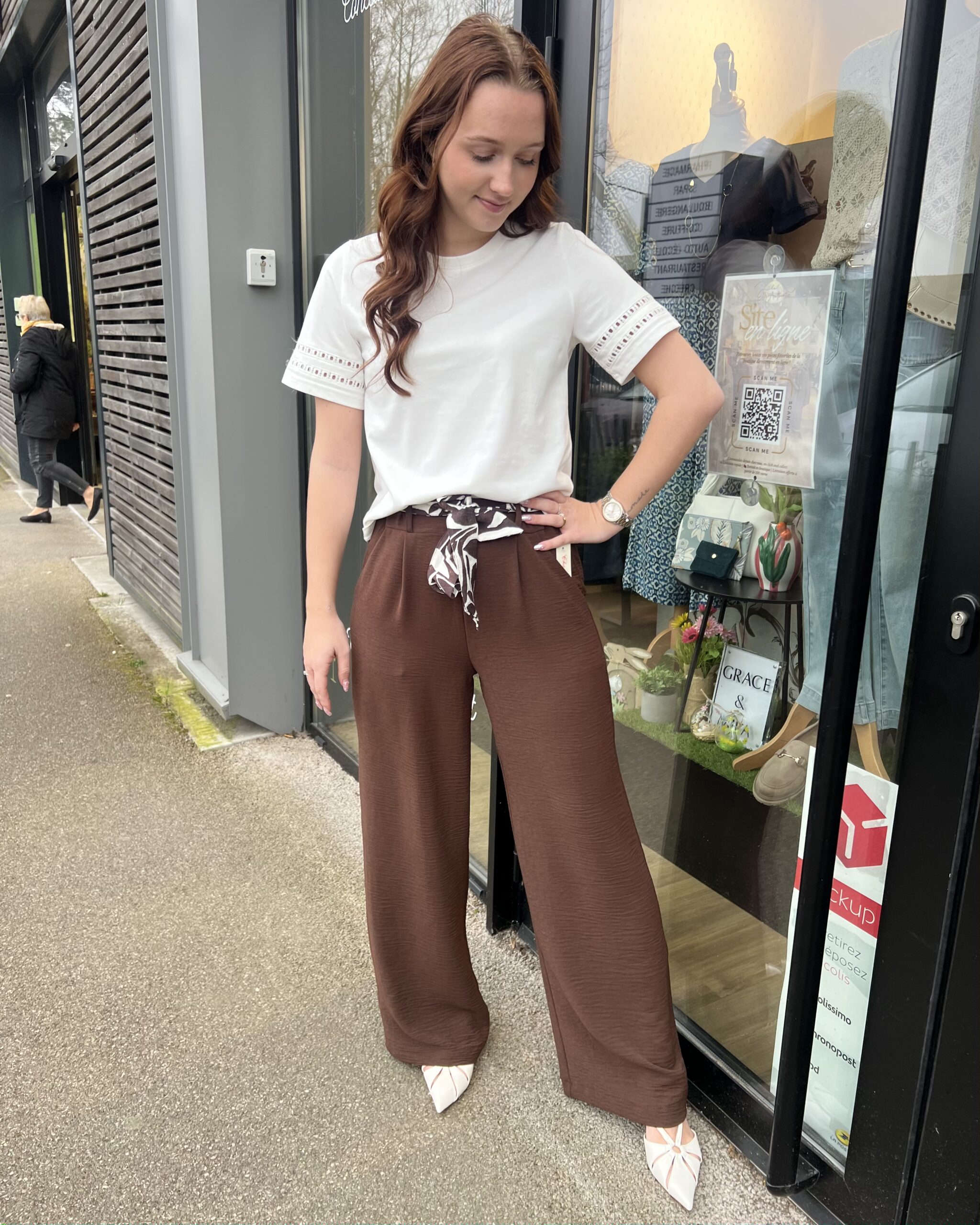 Apportez une touche d’élégance chaleureuse à votre dressing avec ce pantalon choco à taille élastique, sublimé par un détail foulard raffiné. Sa teinte profonde et tendance donne immédiatement du caractère à votre tenue.