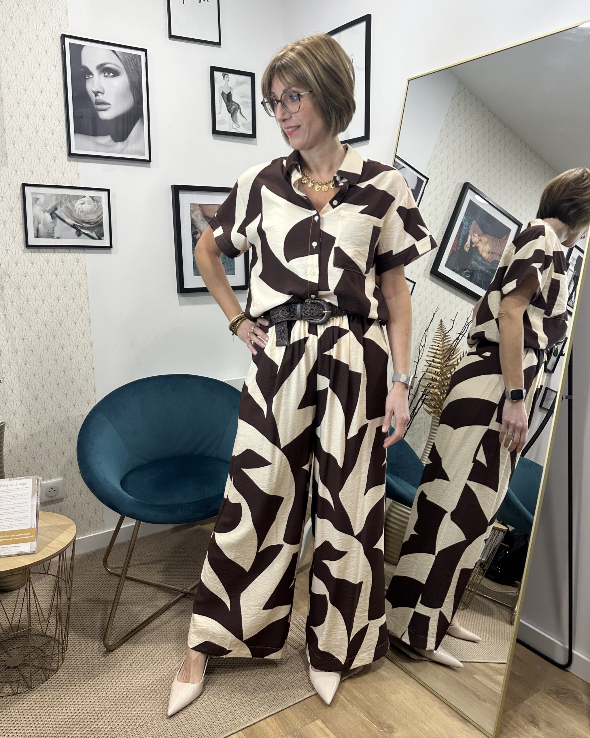 Son imprimé géométrique dans les tons de beige et chocolat crée un contraste harmonieux et graphique. Ce jeu de formes apporte une touche contemporaine tout en restant facile à associer avec des hauts unis.