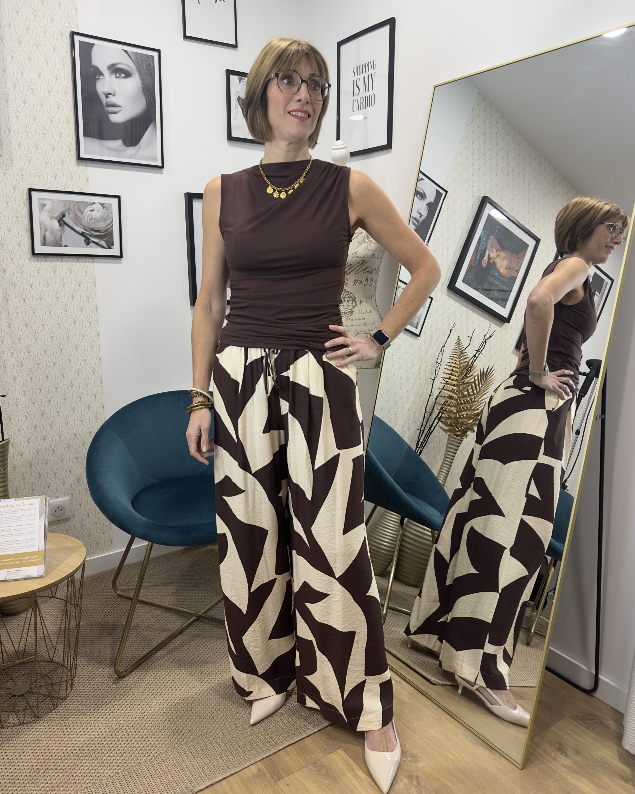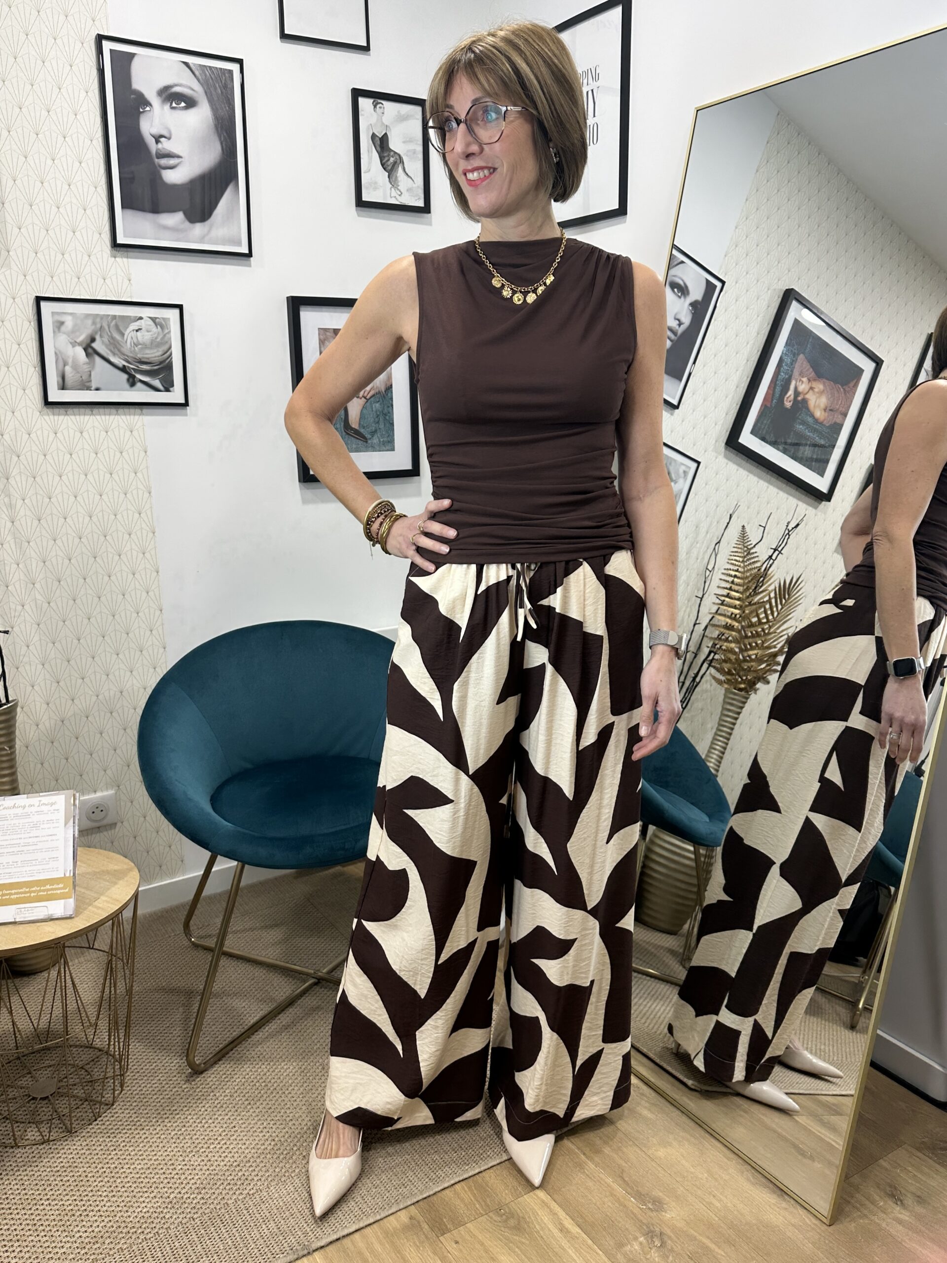 Le pantalon large motif géométrique chocolat est une pièce fluide et moderne qui apporte caractère et élégance à votre tenue. Sa coupe ample offre un tombé léger et accompagne les mouvements avec souplesse, pour un confort optimal au quotidien.