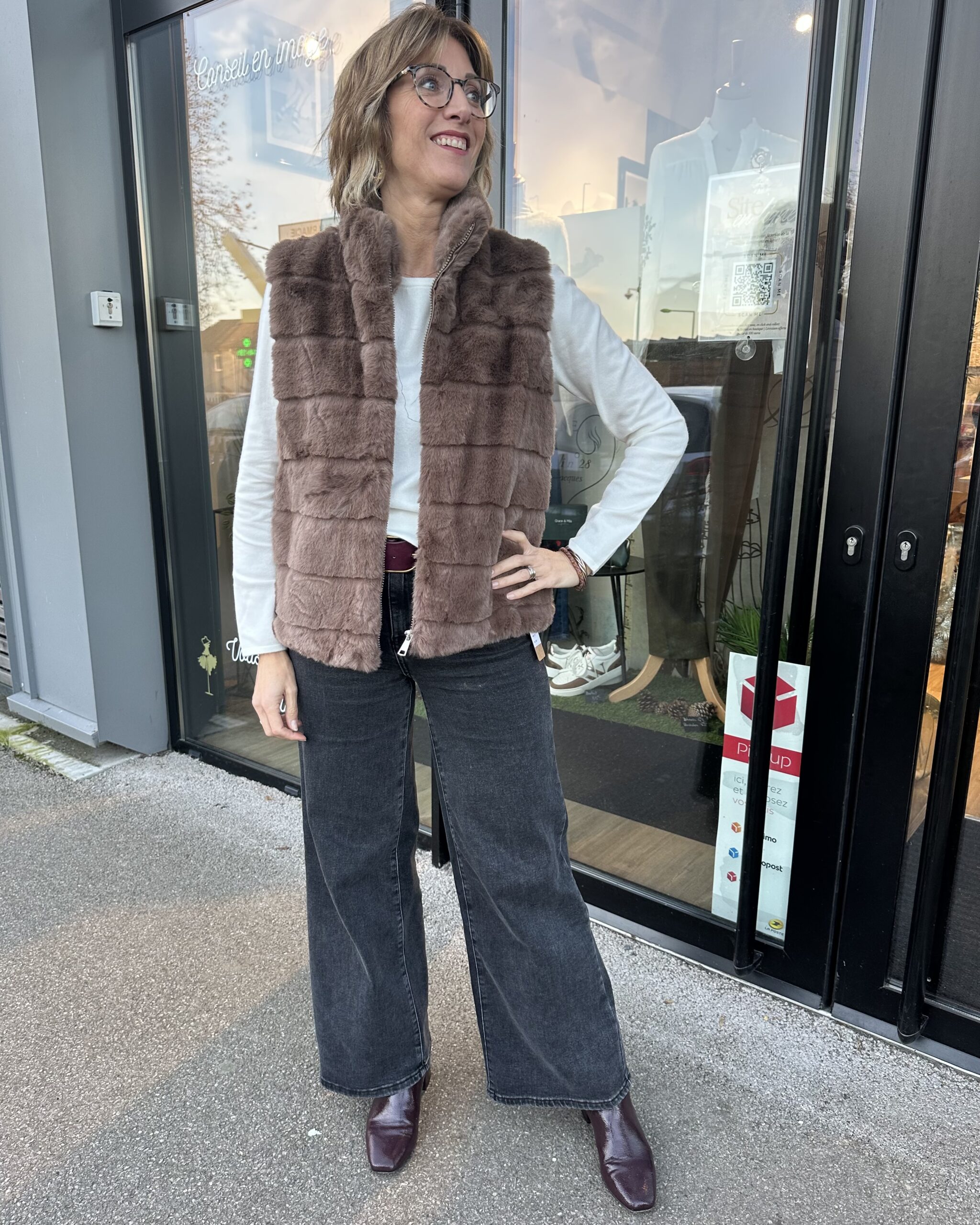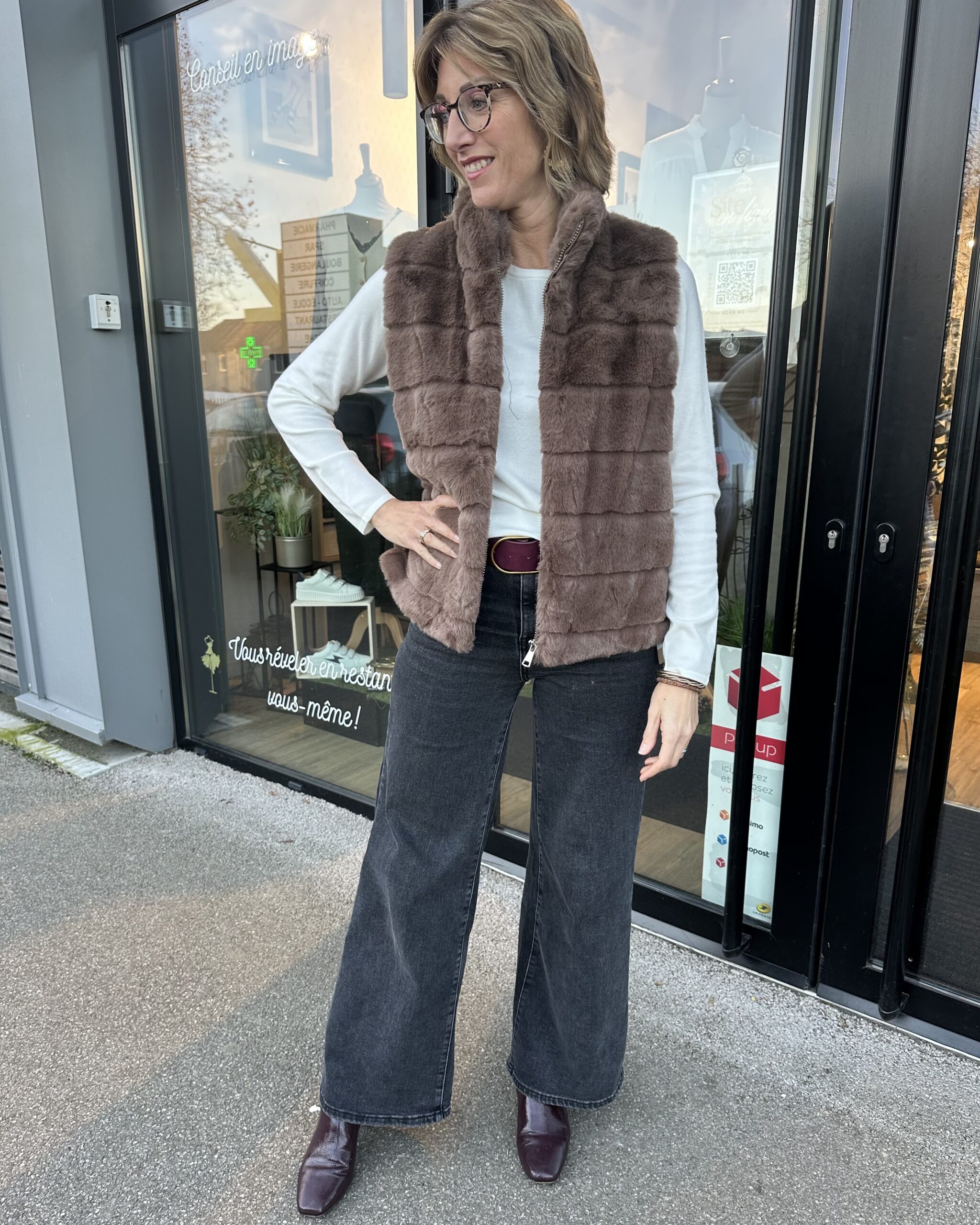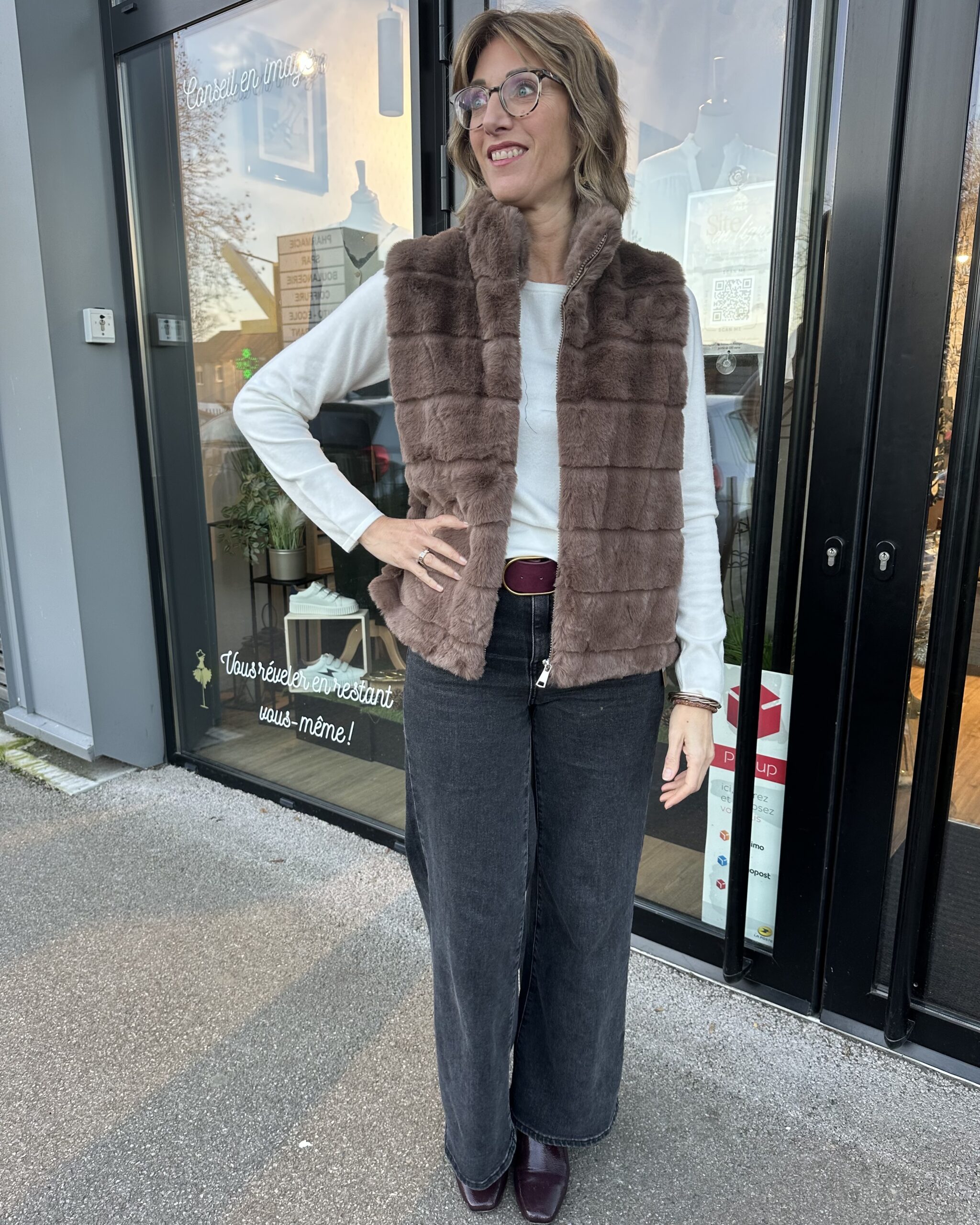 La DOUDOUNE SANS MANCHE FOURRURE MARRON combine style et confort pour un look automnal ou hivernal parfait.