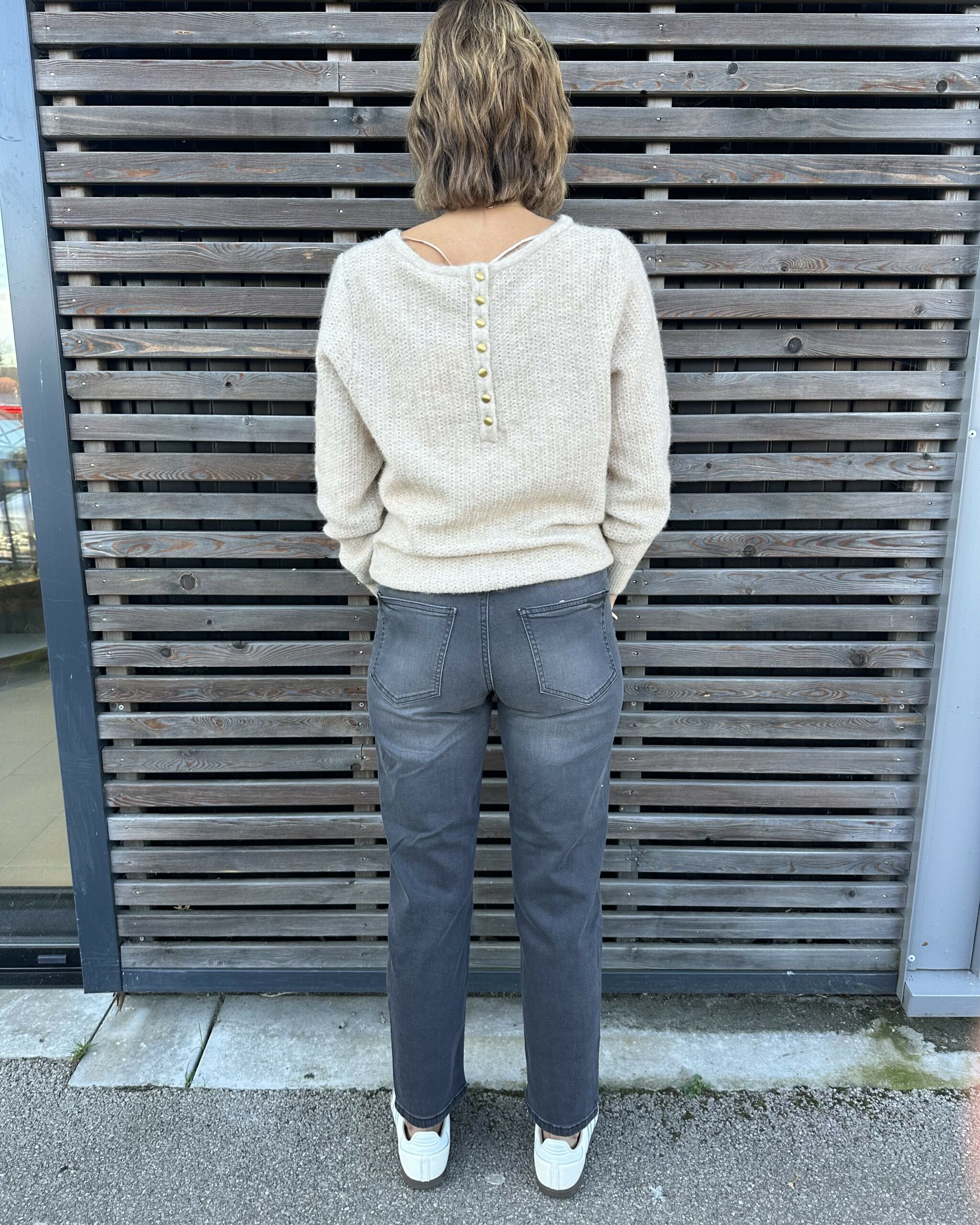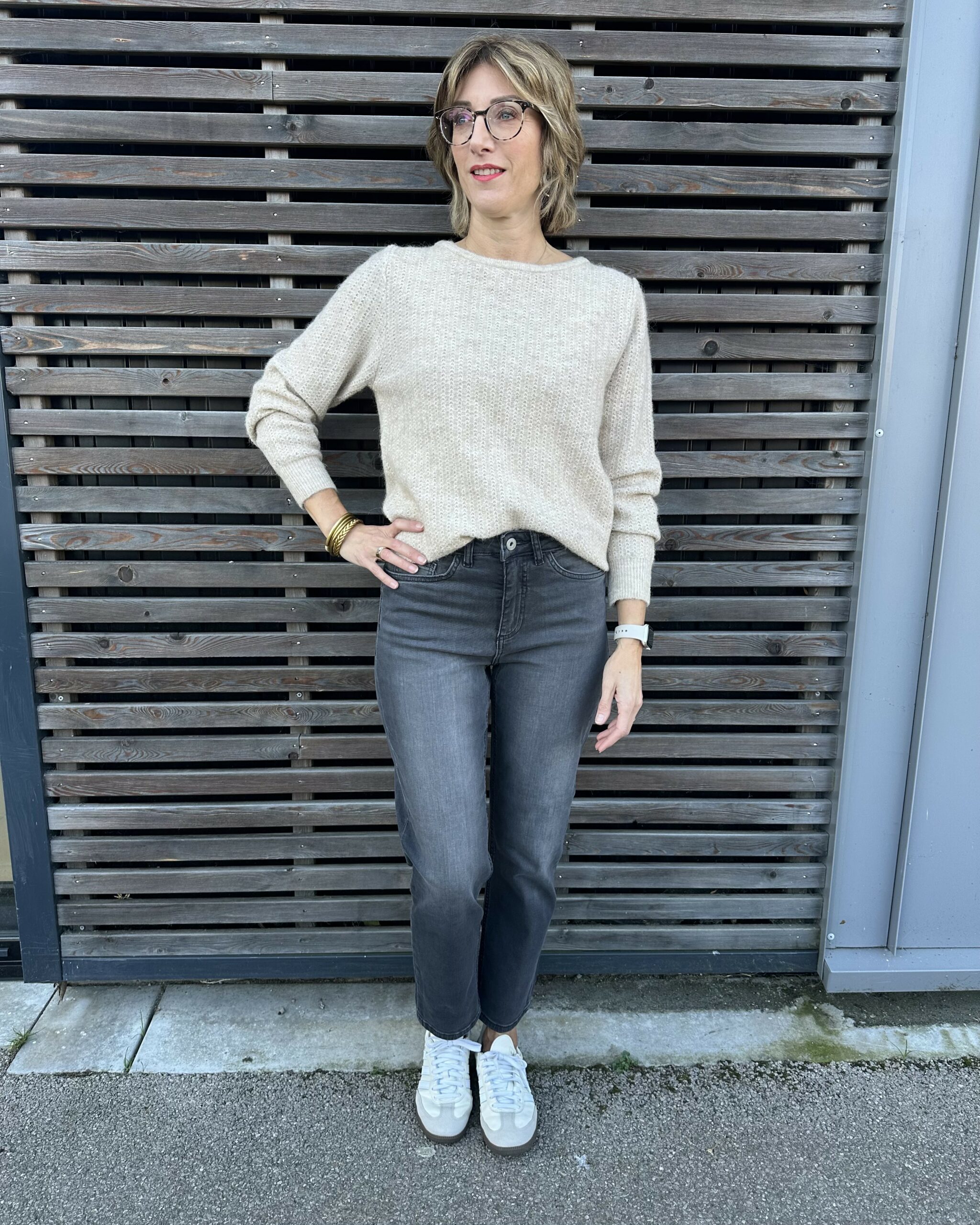 Le jeans mom 7/8 gris est idéal pour les femmes qui ne sont pas très grandes et qui ne souhaitent pas faire d’ourlets. Il s’ajustera en bas de la cheville. Vous pourrez le porter avec des bottines ou des mocassins.