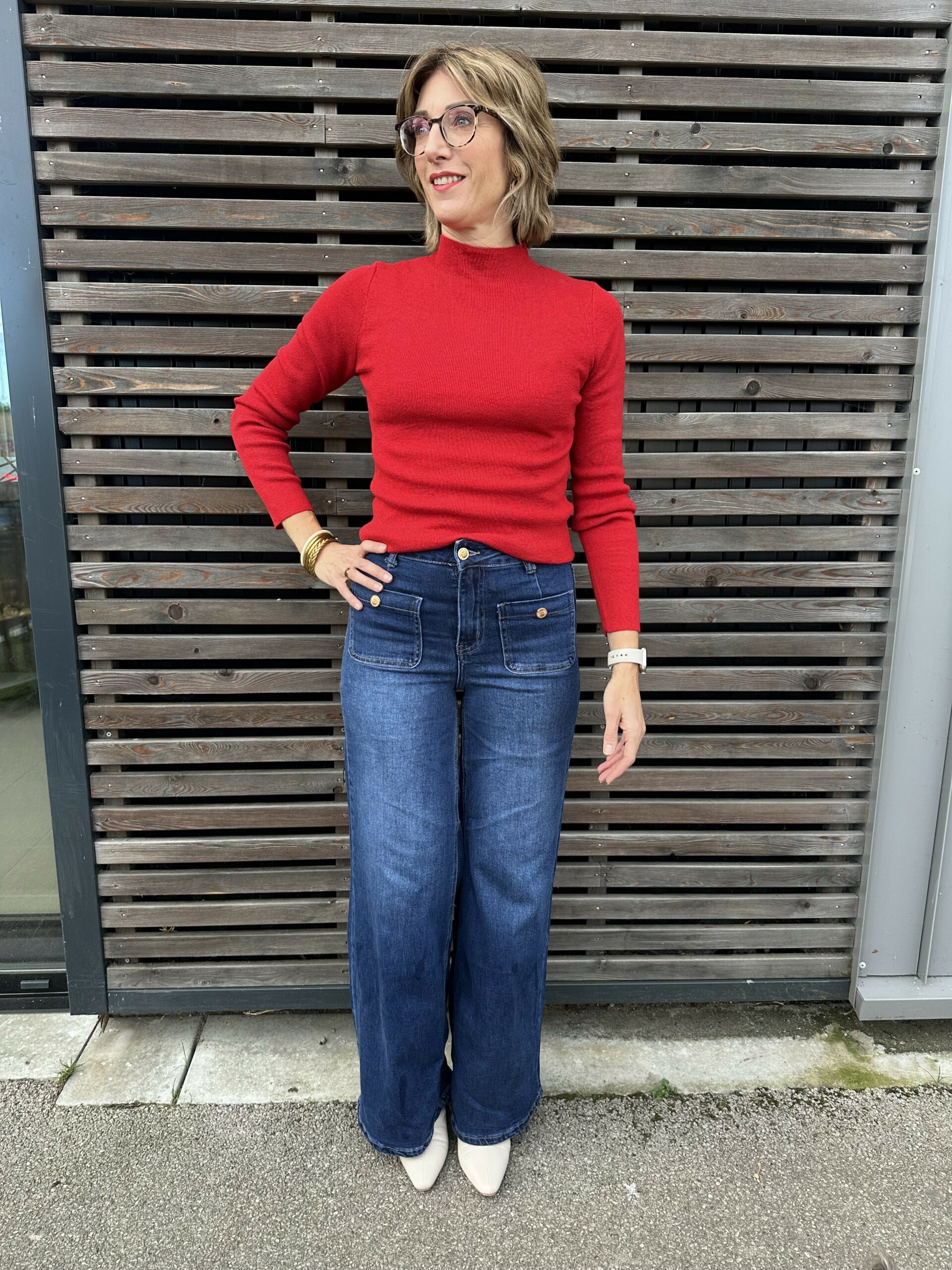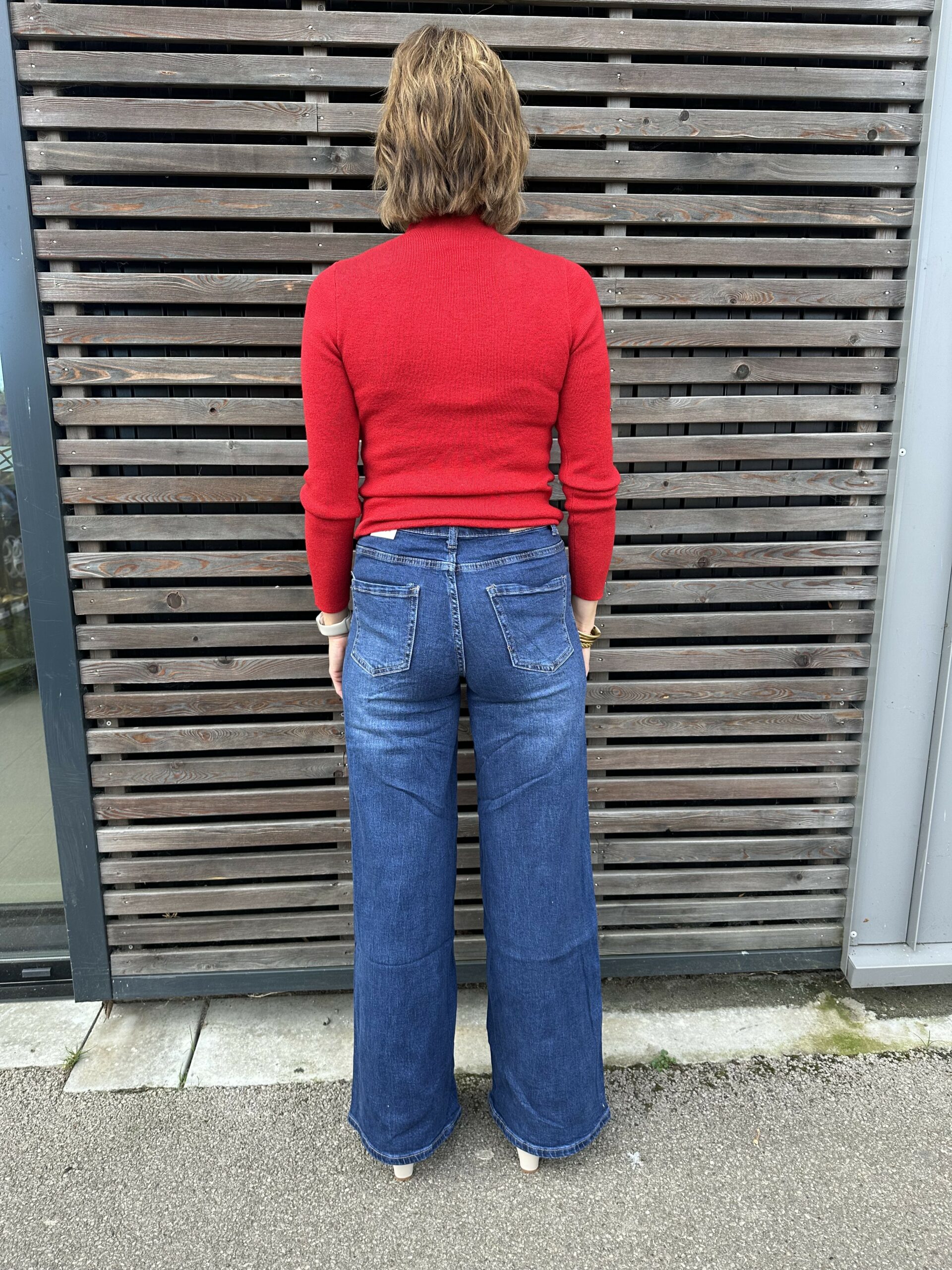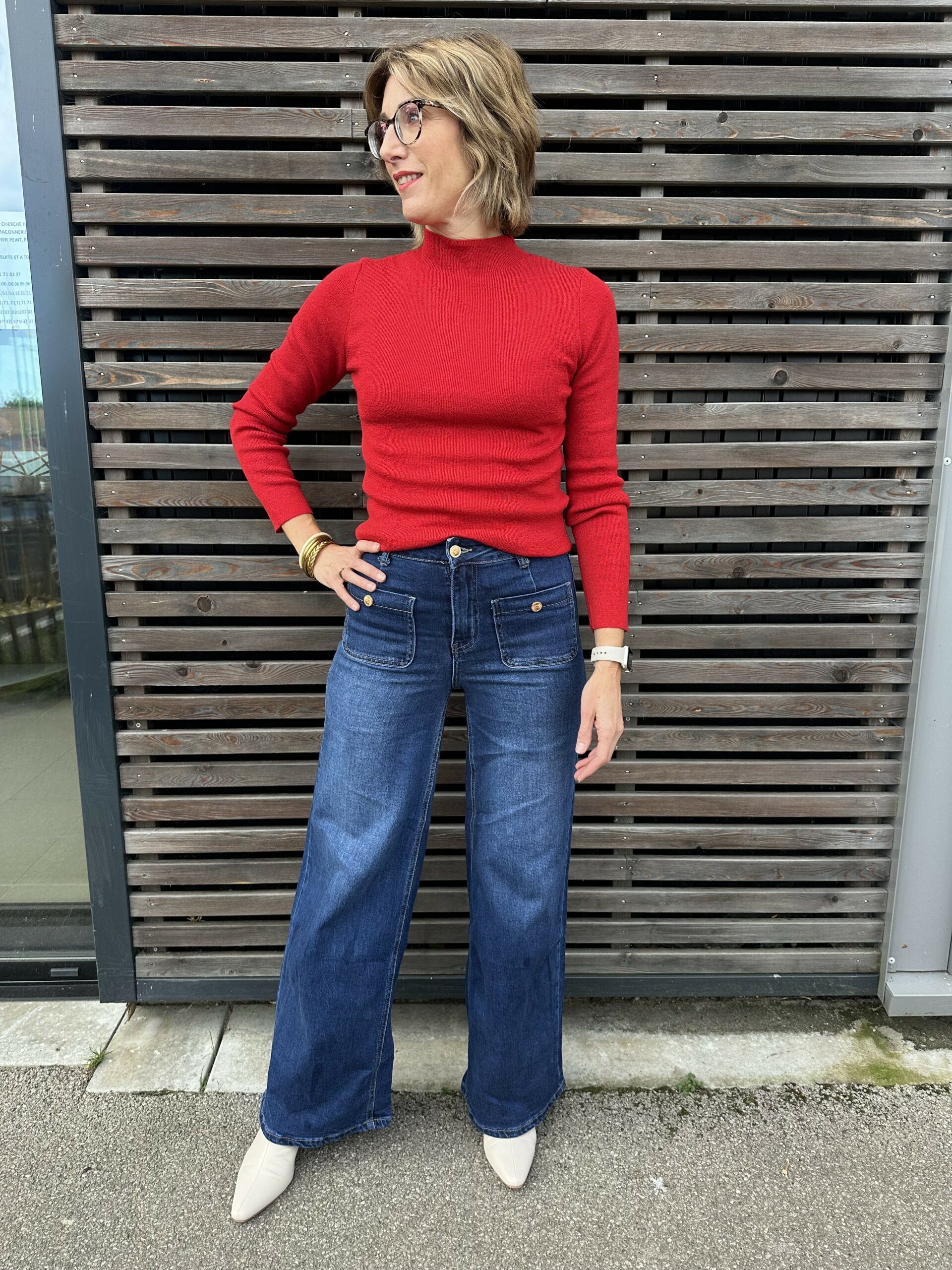 Le jeans wide leg bleu medium à une coupe élégante et adaptée à toutes les morphologies Elle allongera la silhouette. Nous vous conseillons de porter des chaussure à bout pointus et d’éviter les ballerines ou chaussures top plates.