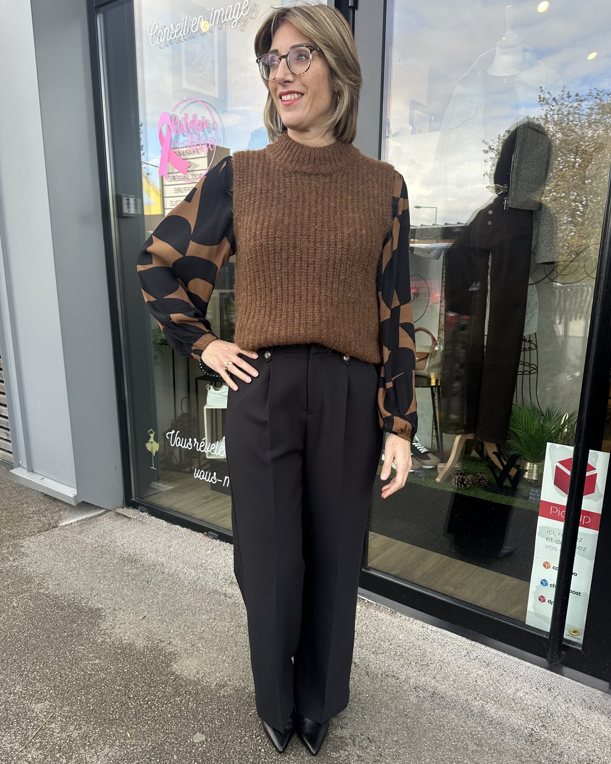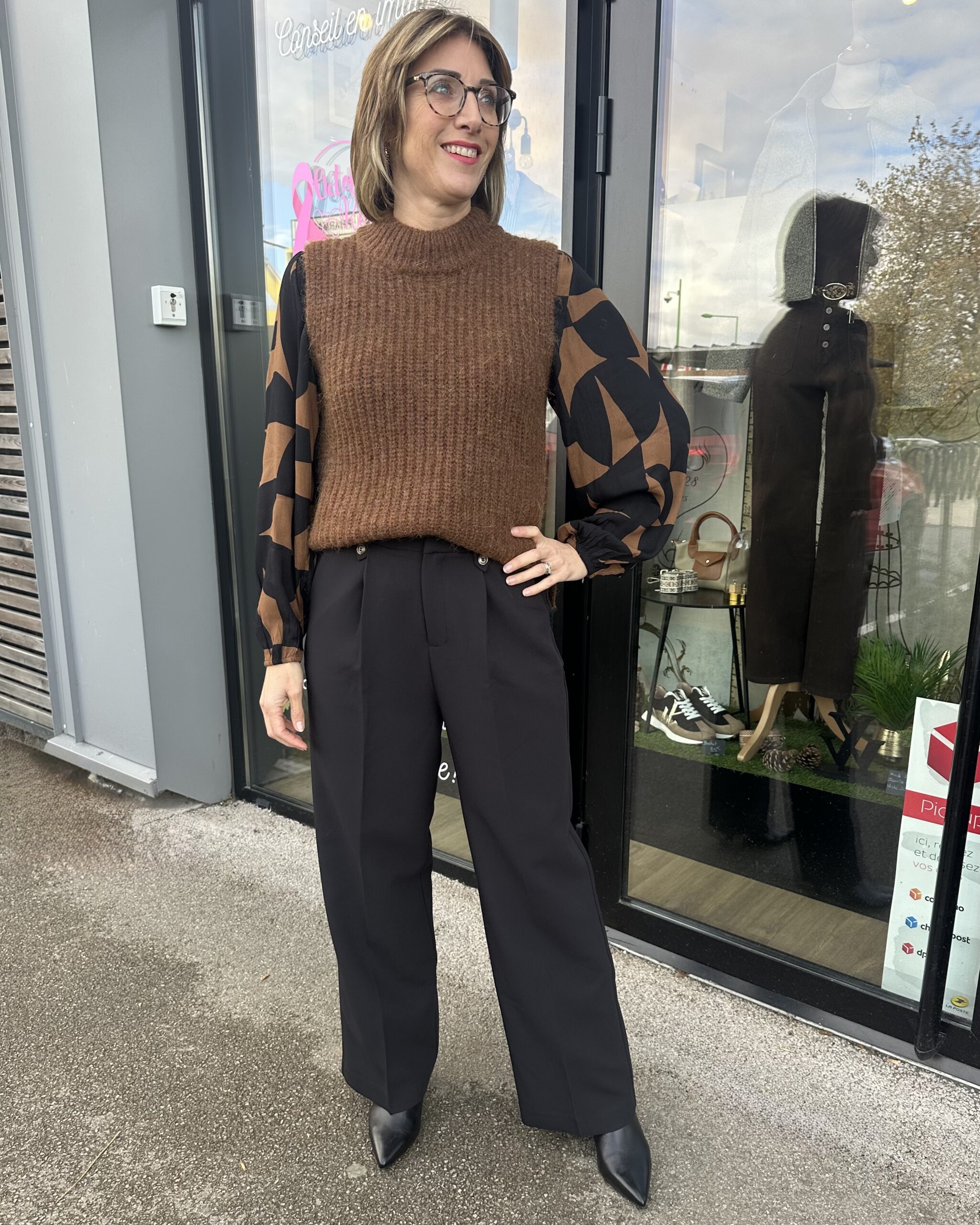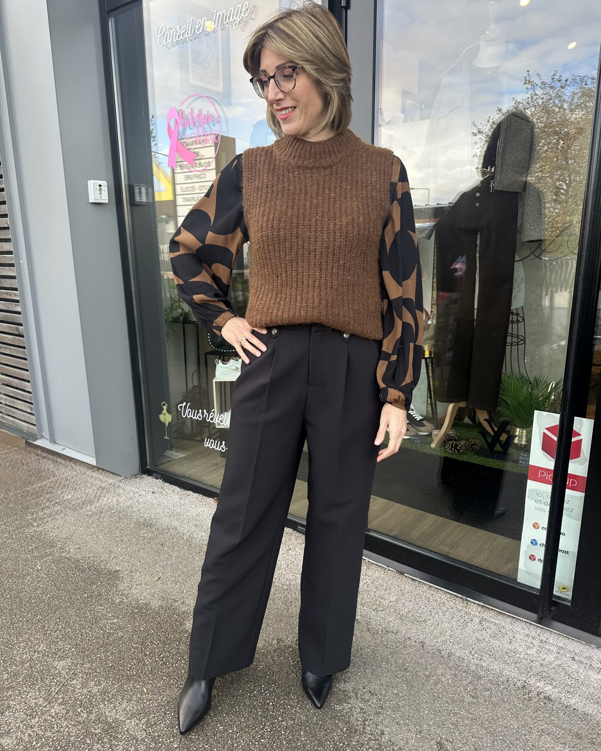 Le pull sans manche marron est un indispensable pour un look à la fois chic et décontracté.