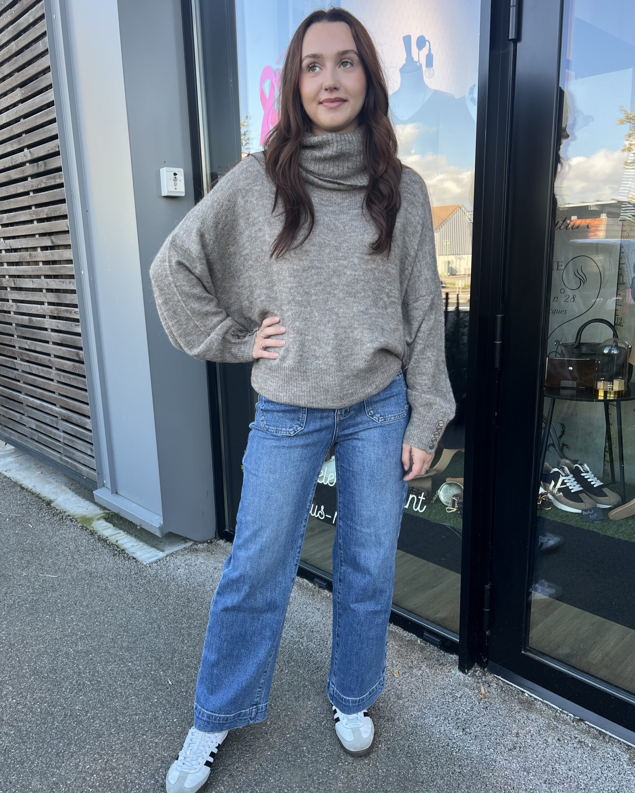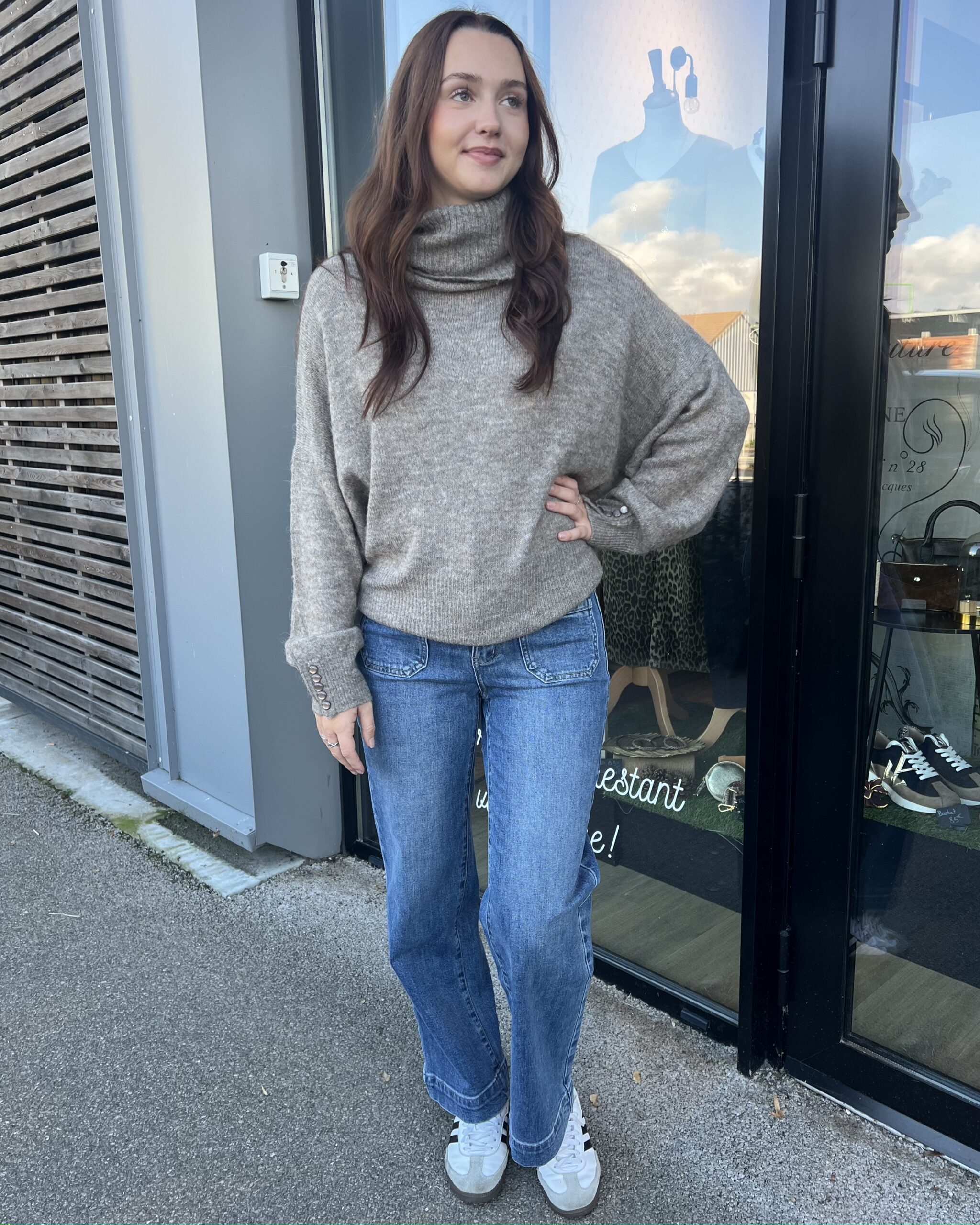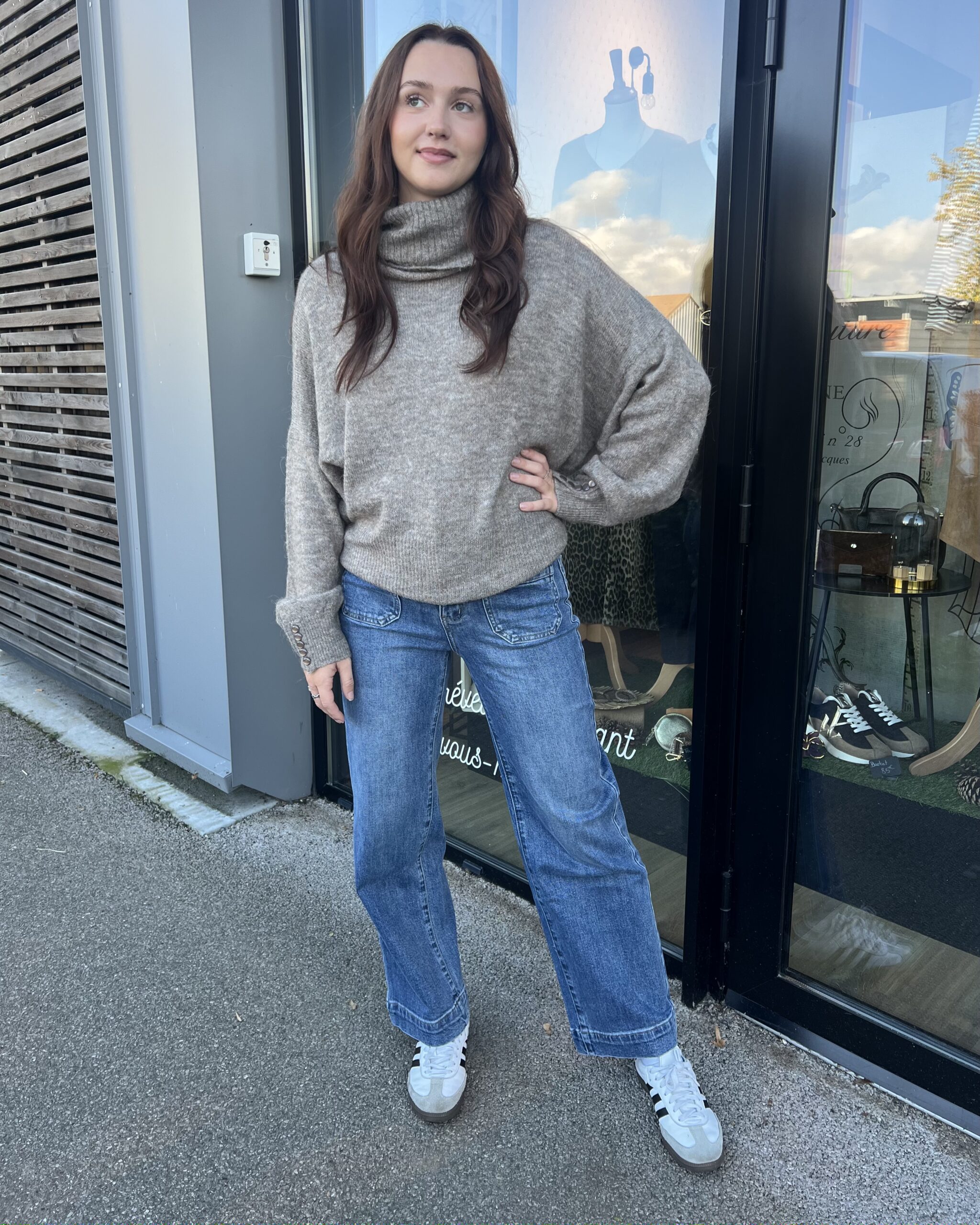 Pull taupe, col cheminé parfait pour l’hiver associé à un jean bleu.
