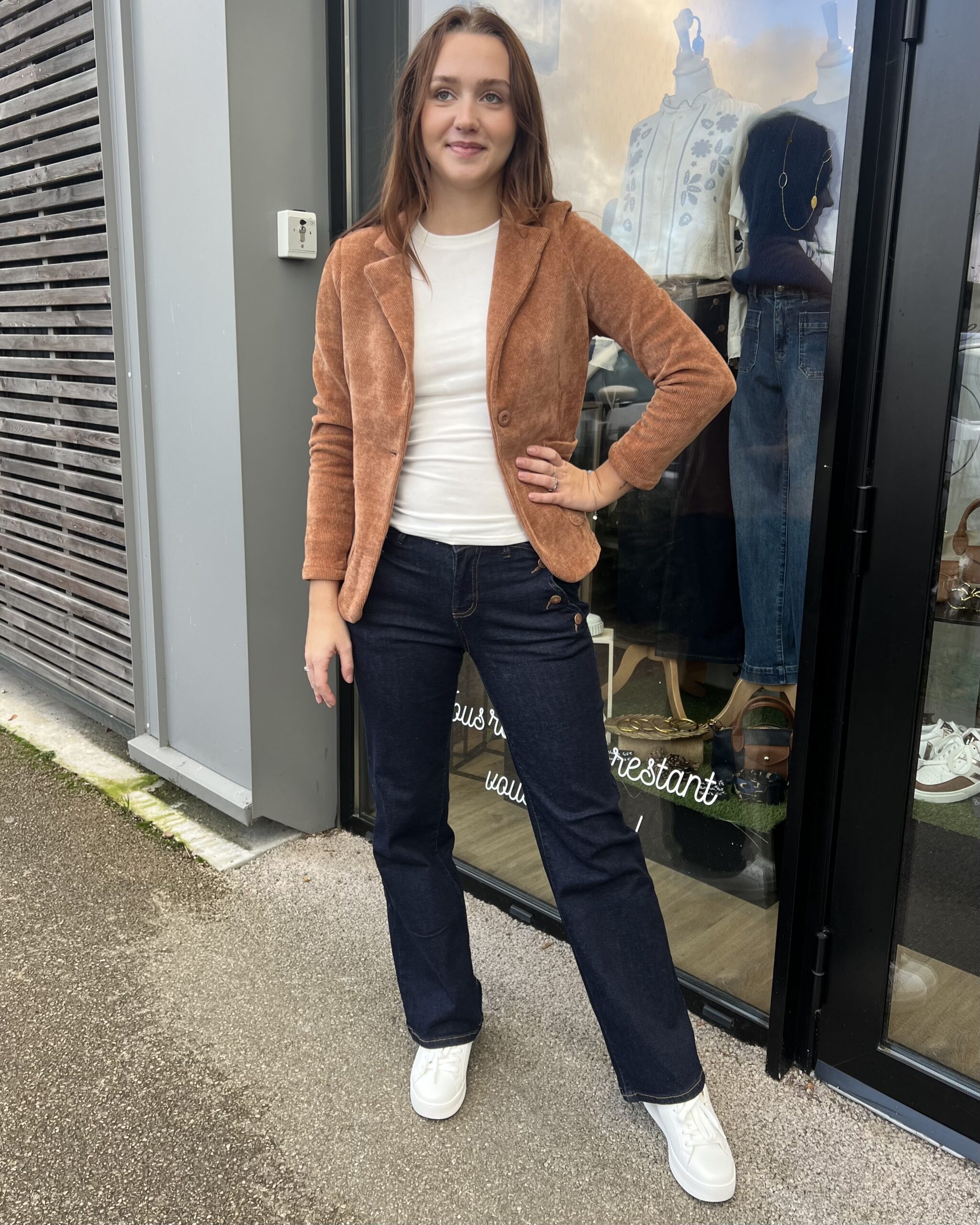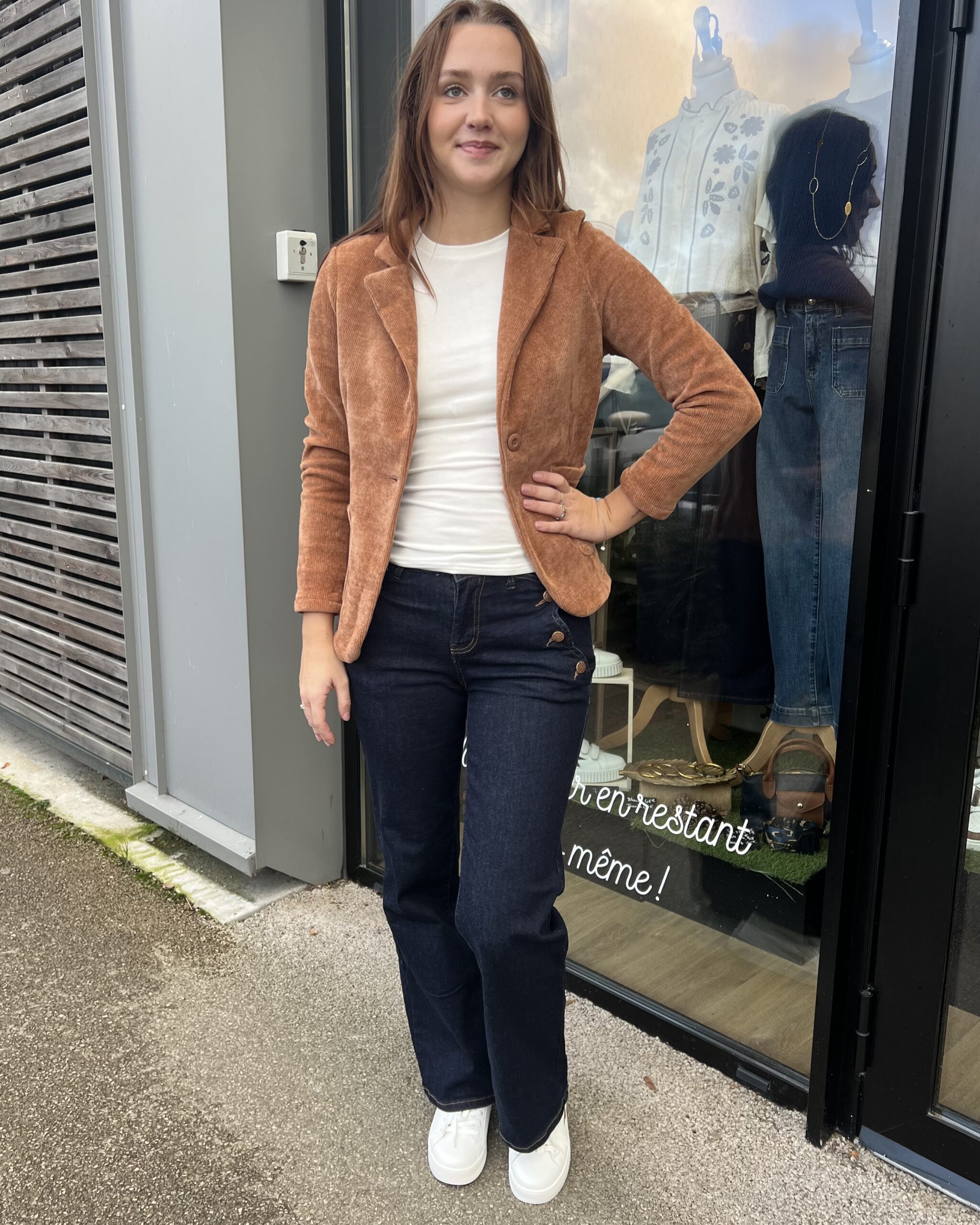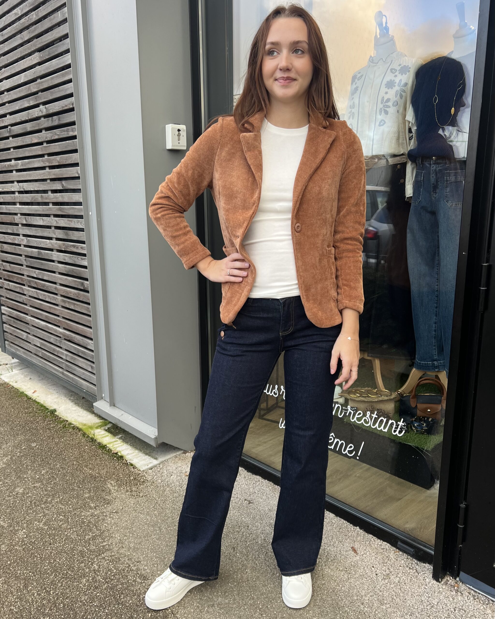 Une veste en velours caramel idéale pour vos journées d’automne ou vos soirées hivernales.