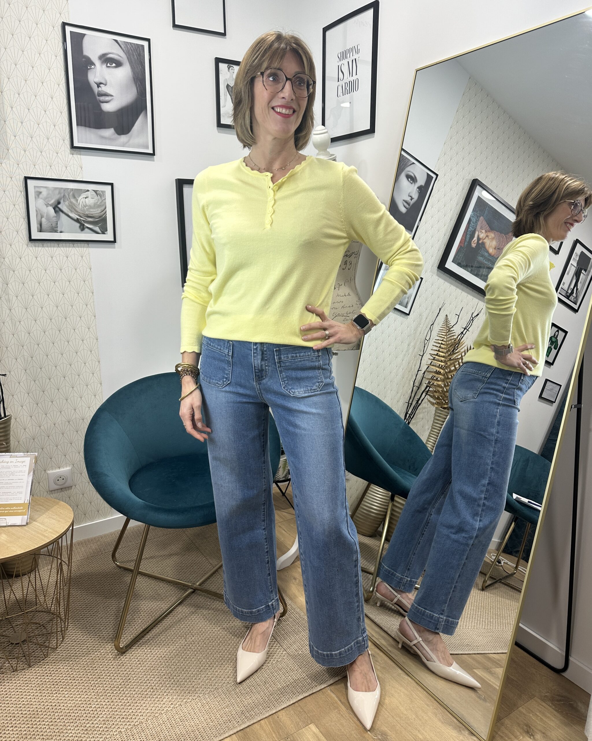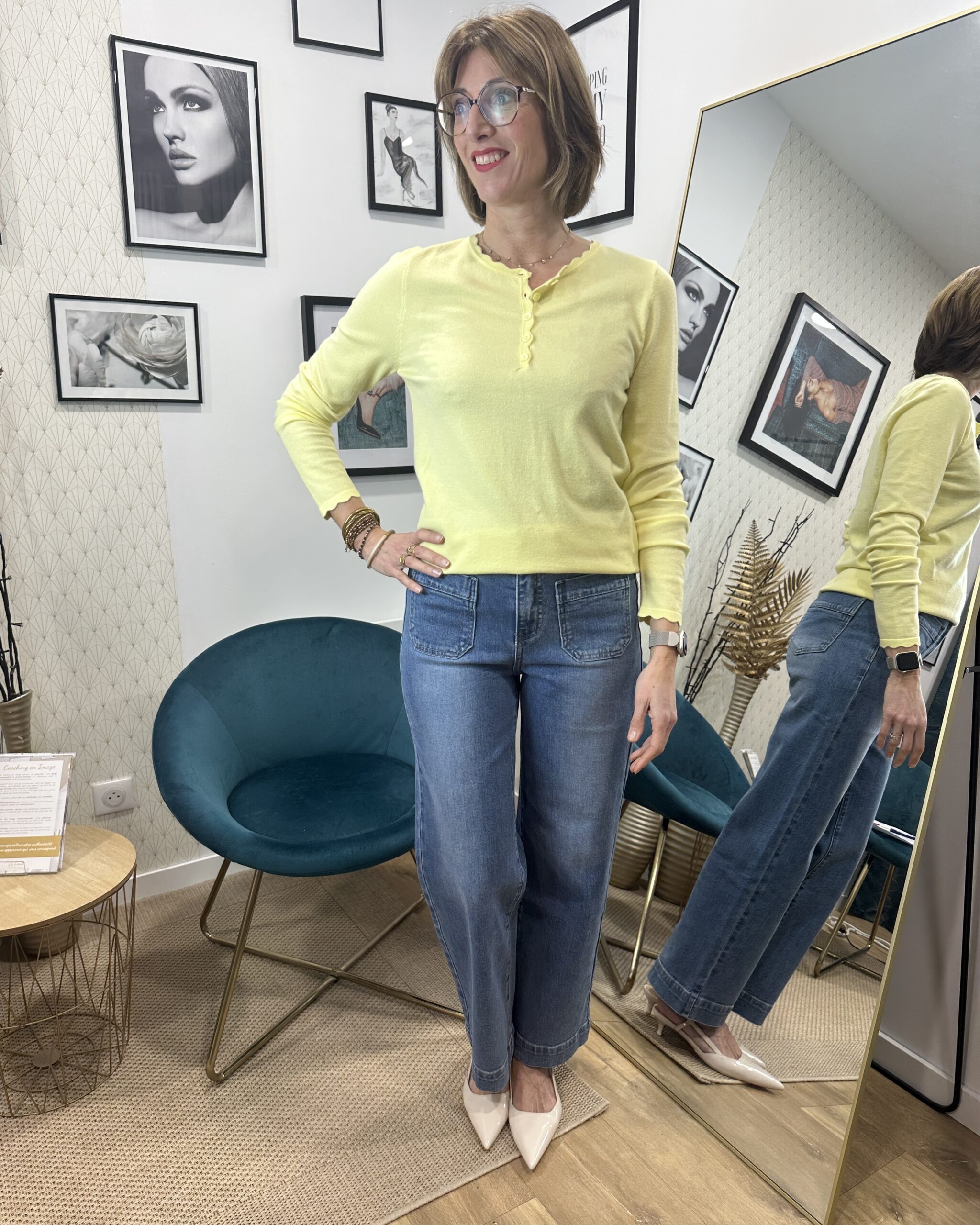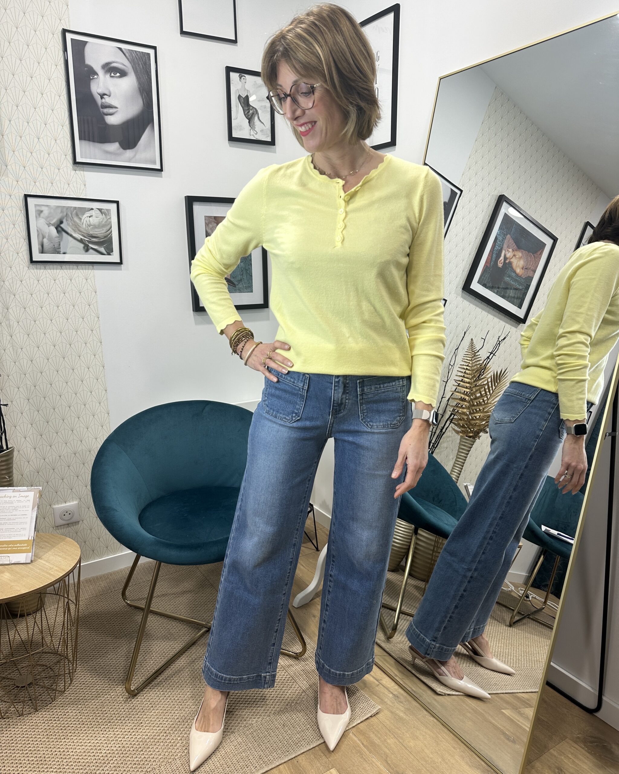La couleur jaune illumine la tenue et apporte une note de vitalité. Elle se marie parfaitement avec des tons neutres comme le blanc, le beige ou le bleu clair, ou peut servir de pièce forte dans un look coloré.