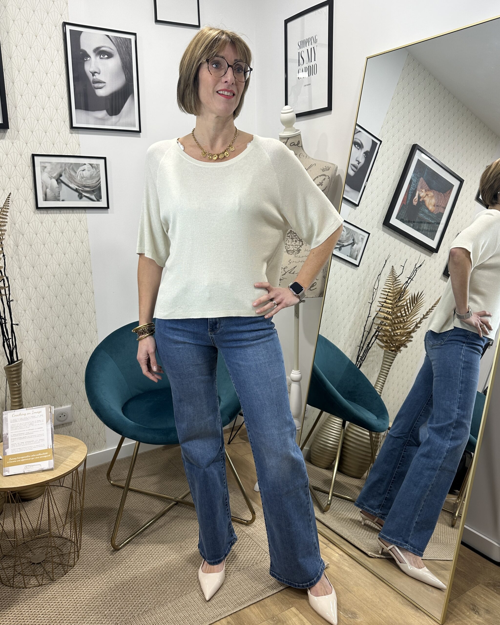 Le fil lurex doré intégré dans le tissu crée un effet scintillant subtil qui illumine la tenue sans excès. Ce détail raffiné permet de porter ce pull aussi bien en journée qu’en soirée.
