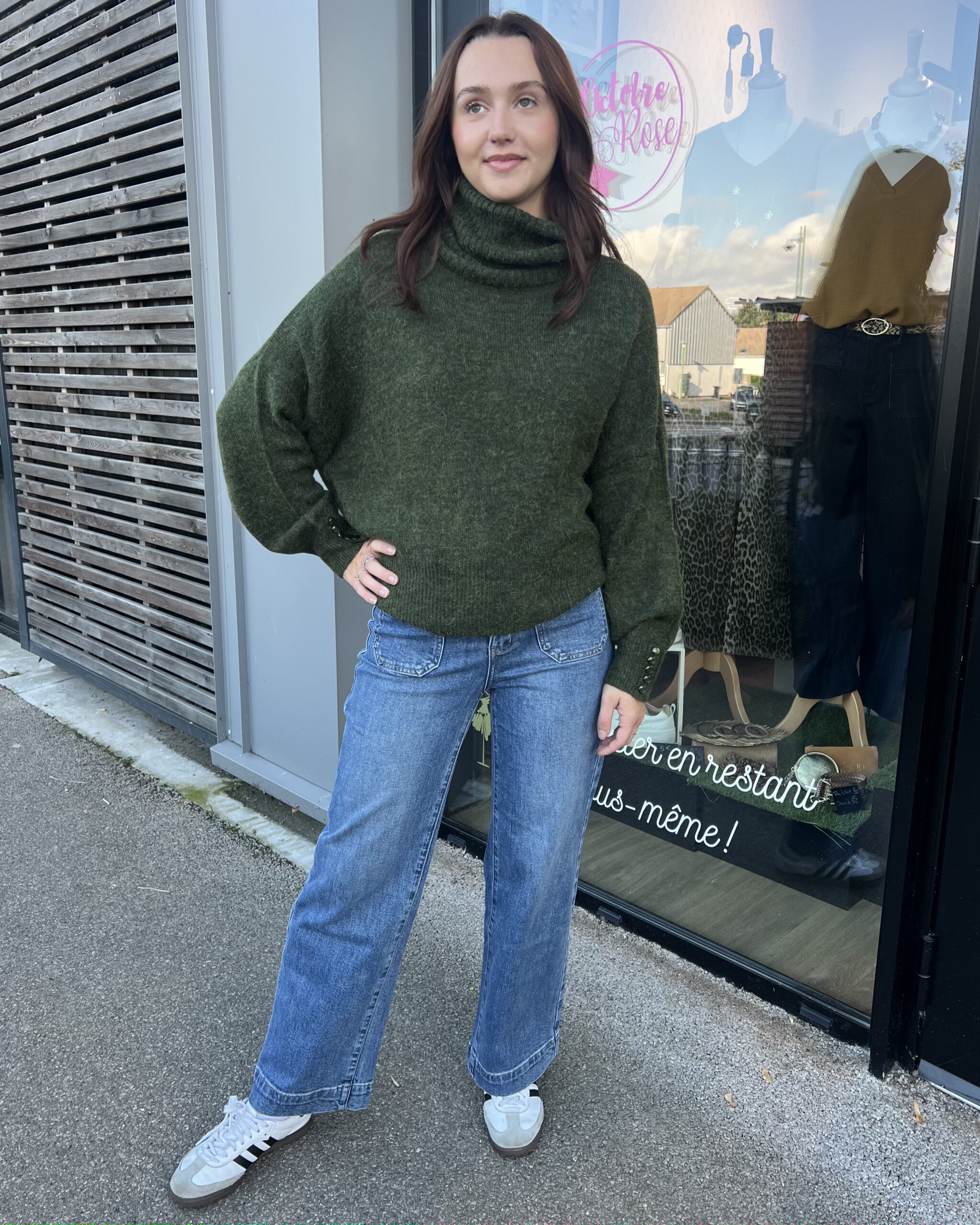 Pull vert foncé, col cheminé. Sa couleur profonde apporte une touche de fraîcheur à votre look, tandis que le jean bleu qui l’accompagne souligne votre silhouette avec simplicité et élégance. Sa couleur profonde apporte une touche de fraîcheur à votre look, tandis que le jean bleu qui l’accompagne souligne votre silhouette avec simplicité et élégance.