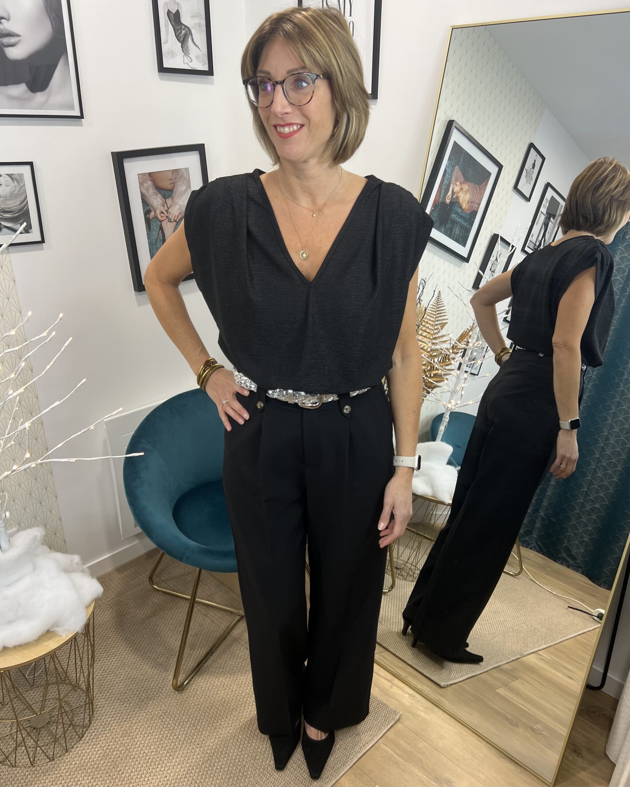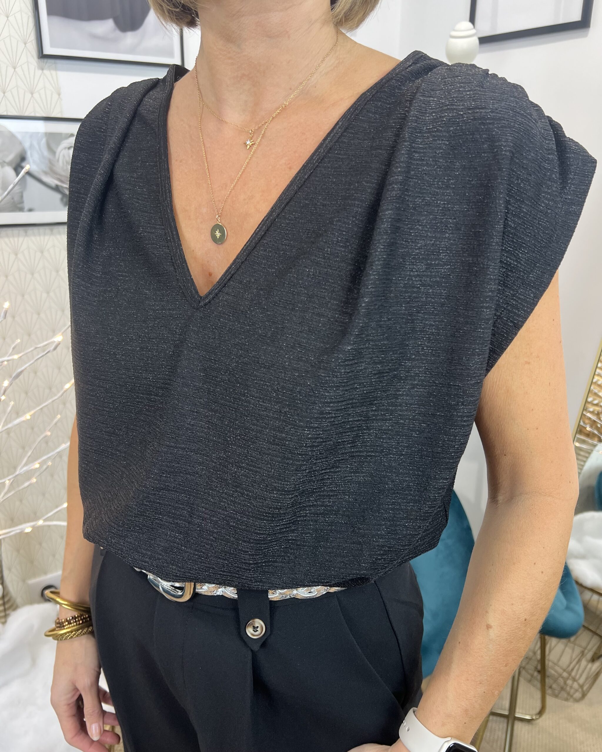Ce top sans manche noir est une pièce essentielle pour composer des looks élégants et modernes. Sa coupe intemporelle met en valeur la silhouette tout en offrant un confort optimal. Son style raffiné en fait également un choix parfait pour les fêtes, permettant de créer une tenue sophistiquée avec simplicité.