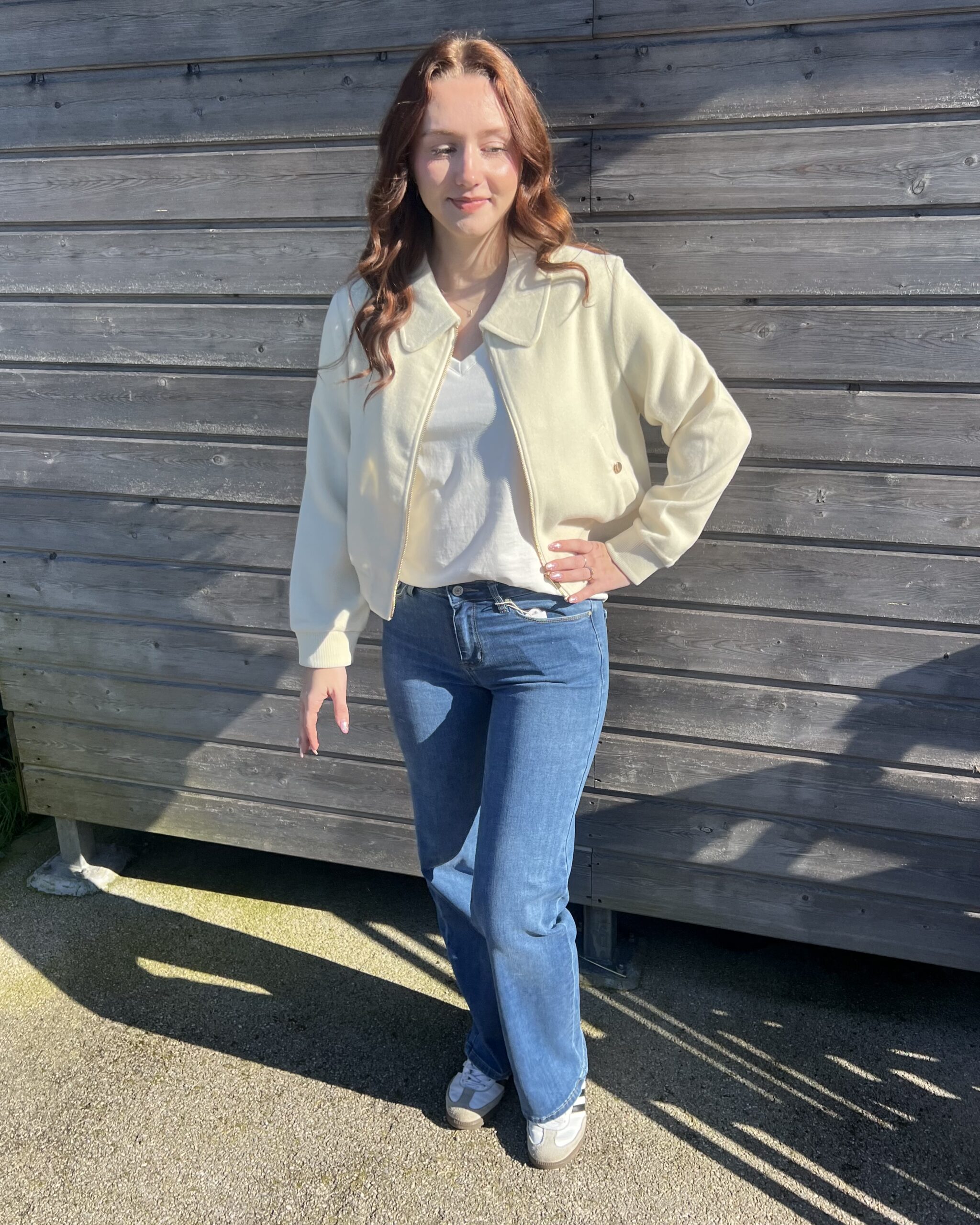 La couleur écru, douce et lumineuse, s’associe facilement avec de nombreuses pièces du dressing. Cette veste peut être portée avec un jean pour un style casual, avec une robe pour un contraste élégant ou avec un pantalon pour une silhouette plus structurée.