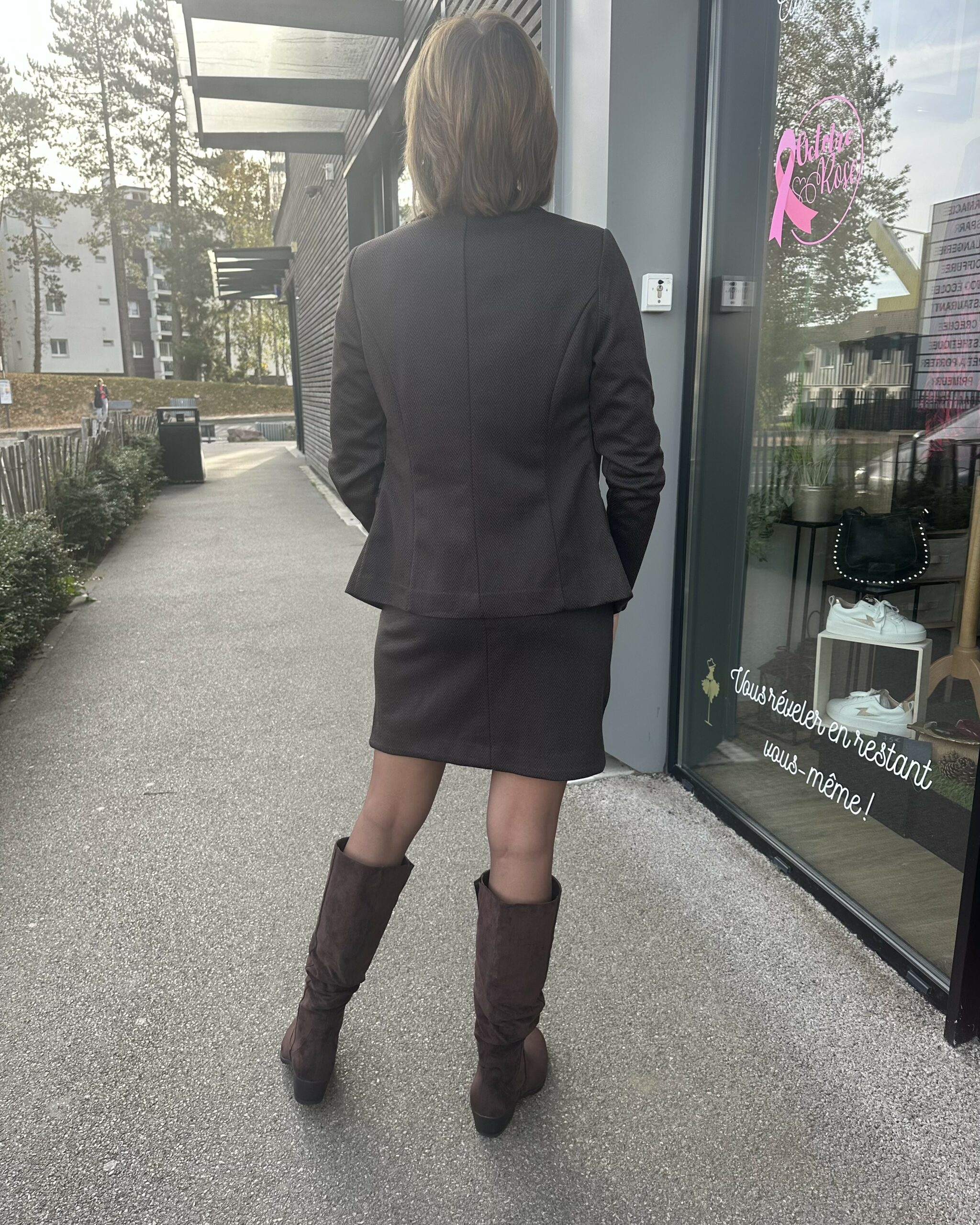 Superbe veste jacquard noir et marron, parfaite pour apporter élégance à une tenue. Portée avec la jupe pour un ensemble tailleur ou avec un jeans brut ou encore un jean ou pantalon marron. Il y aura plein de possibilités pour l’associer et avoir des looks différents.