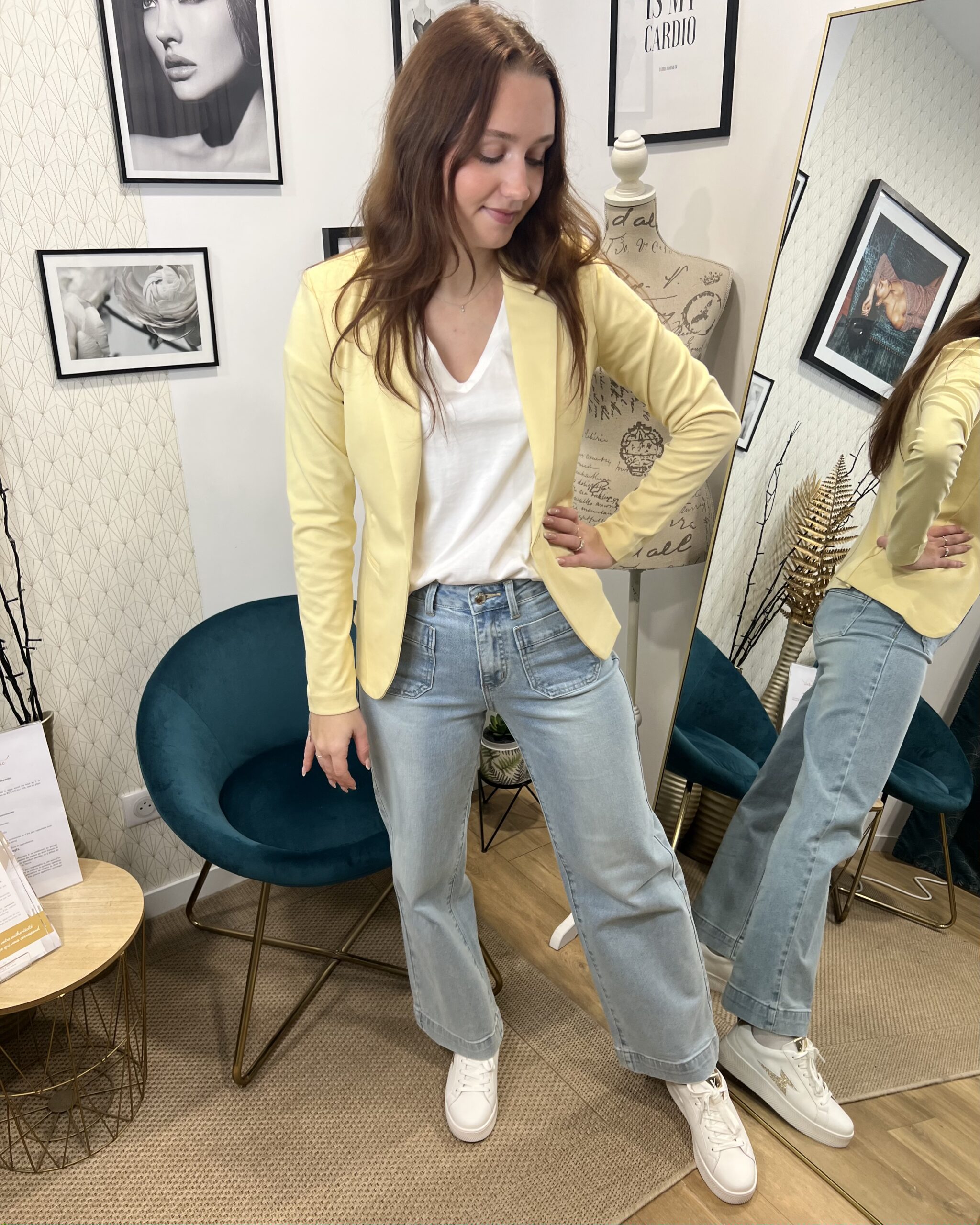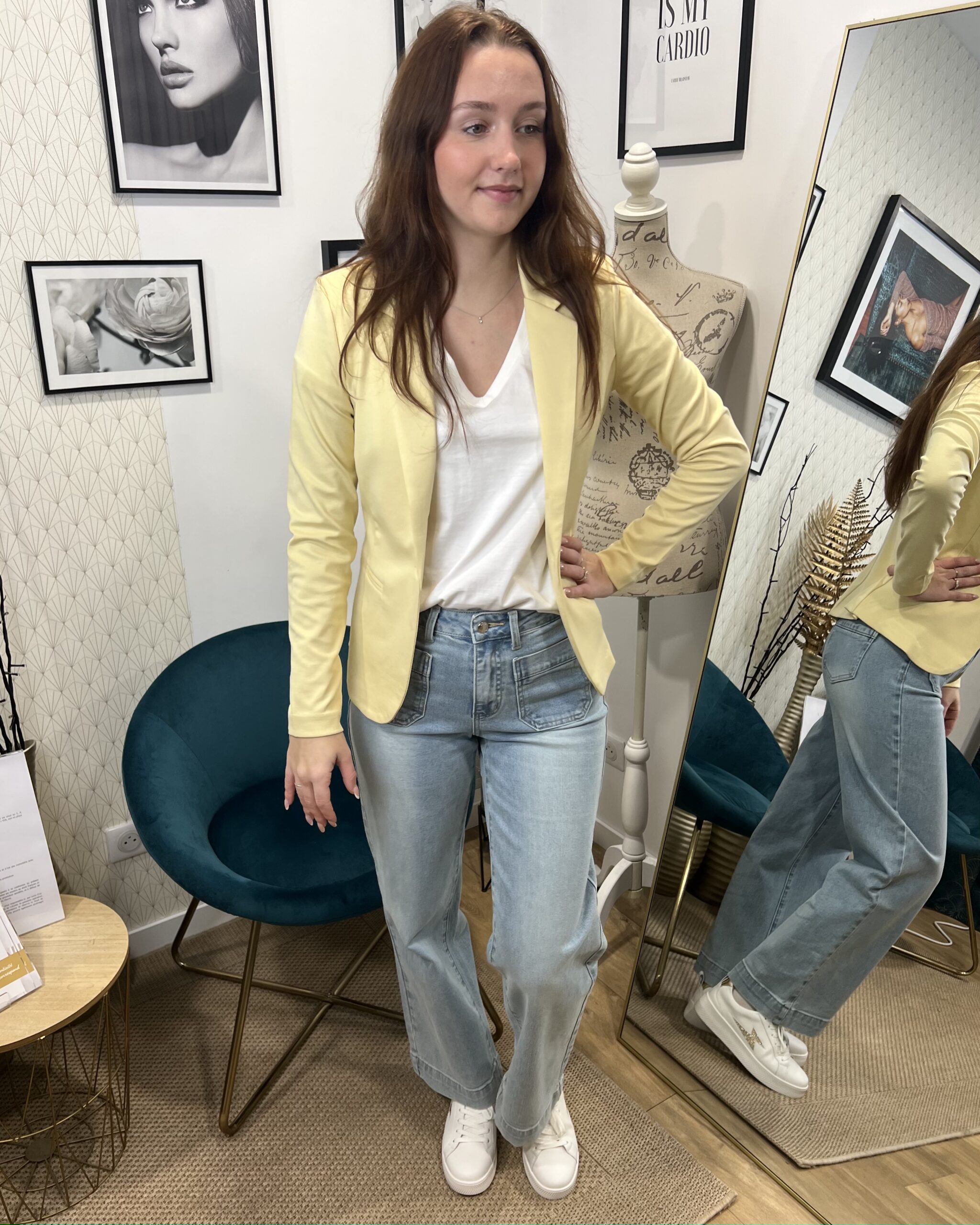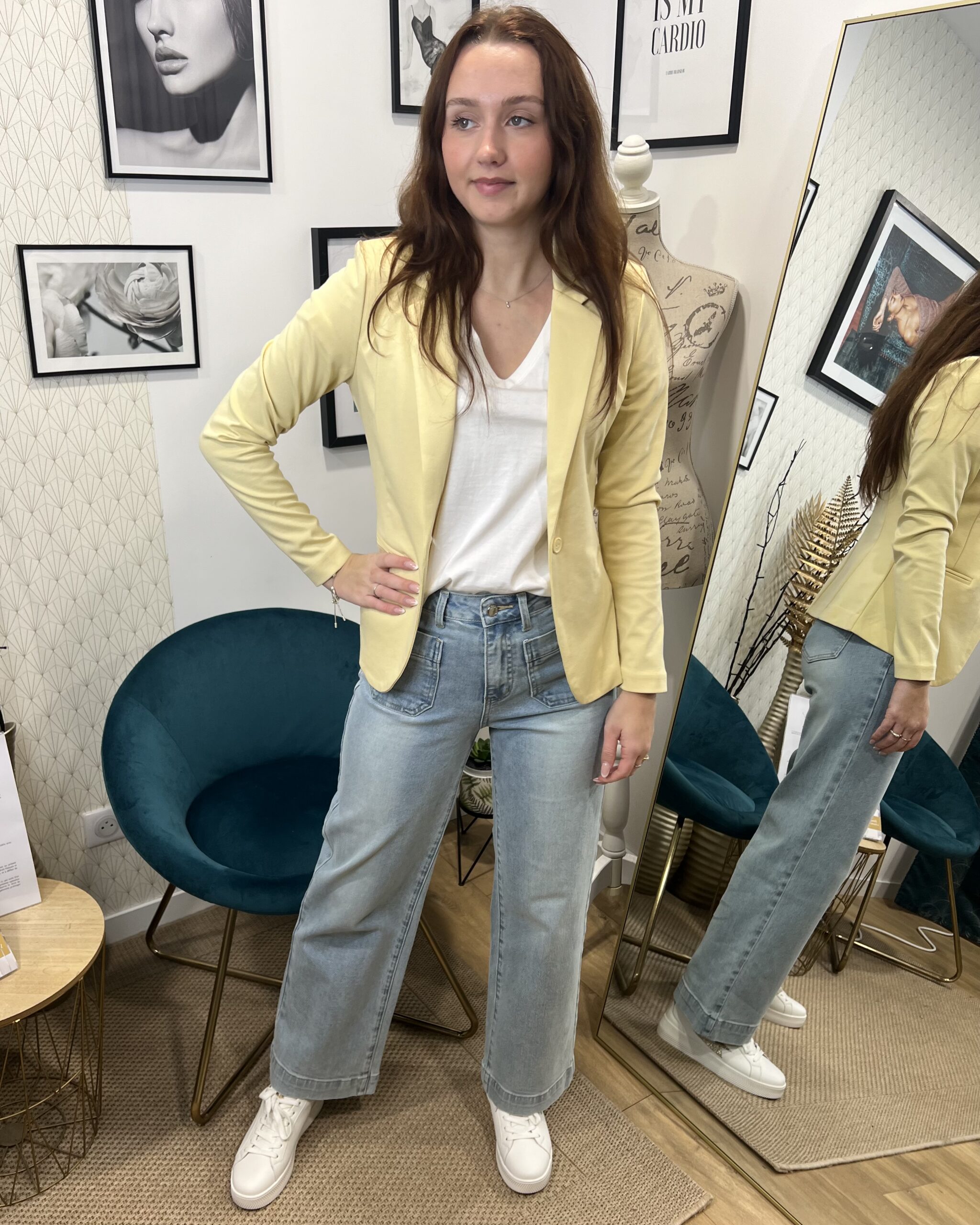 Polyvalente et facile à assortir, cette veste jaune pastel se marie aussi bien avec un jean clair qu’avec une robe pour un look chic et lumineux.